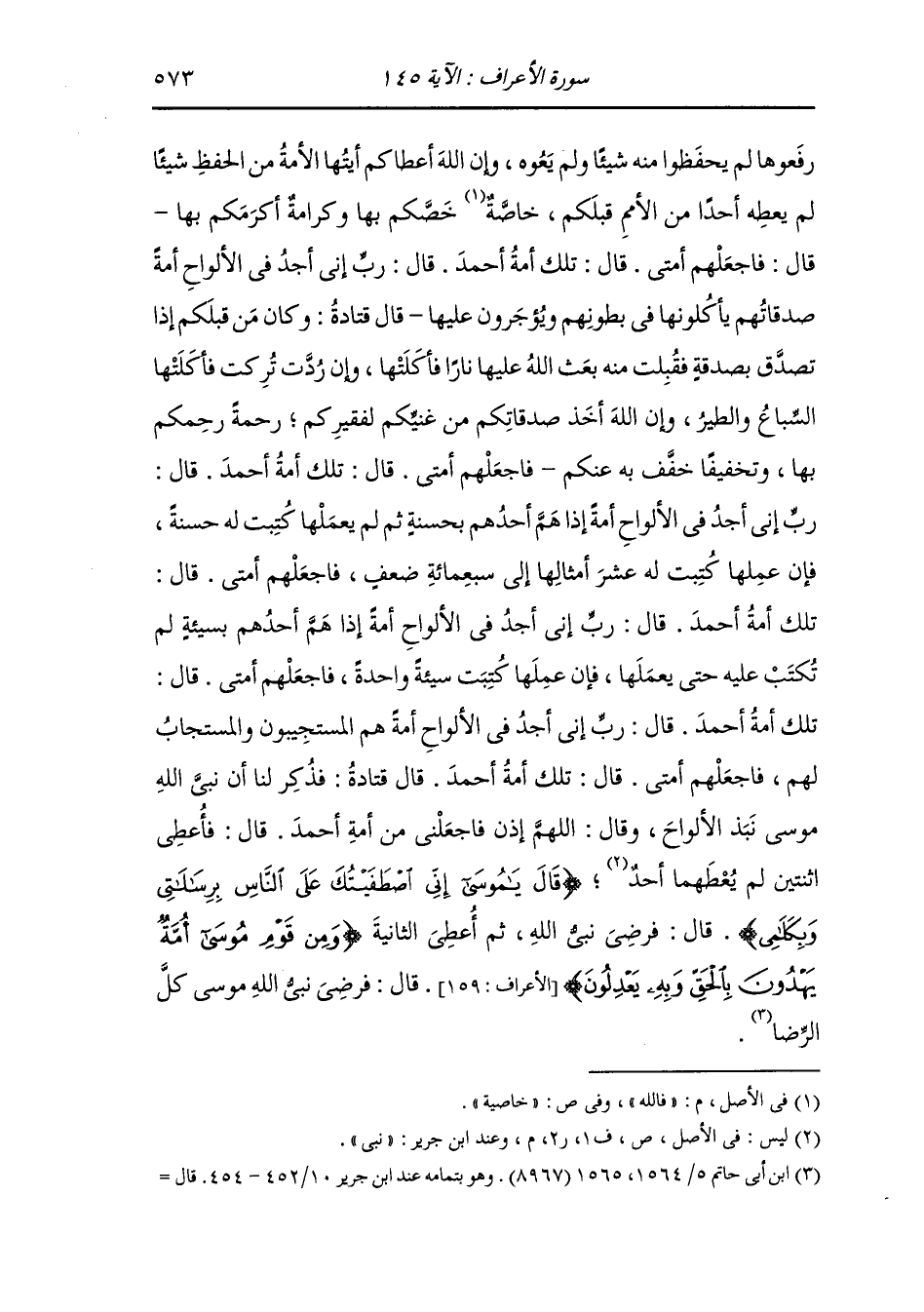 إني أجد في الألواح أمة إذا هم أحدهم بحسنة ثم لم يعملها كتبت له حسنة فإن عملها كتبت له عشر أمثالها إلى سبعمائة ضعف فاجعلهم أمتي ، قال : تلك أمة أحمد ، قال : رب إني أجد في الألواح أمة إذا هم أحدهم بسيئة لم تكتب عليه حتى يعملها فإن عملها كتبت سيئة واحدة فاجعلهم أمتي ، قال : تلك أمة أحمد ، قال : رب إني أجد في الألواح أمة هم المستجيبون والمستجاب لهم فاجعلهم أمتي ، قال : تلك أمة أحمد ، قال قتادة : فذكر لنا أن نبي الله موسى نبذ الألواح وقال : اللهم إذا فاجعلني من أمة أحمد ، قال : فأعطي اثنتين لم يعطهما {قال يا موسى إني اصطفيتك على الناس برسالاتي وبكلامي} الأعراف الآية 144 قال : فرضي نبي الله ثم أعطى الثانية {ومن قوم موسى أمة يهدون بالحق وبه يعدلون} قال : فرضي نبي الله موسى كل الرضا