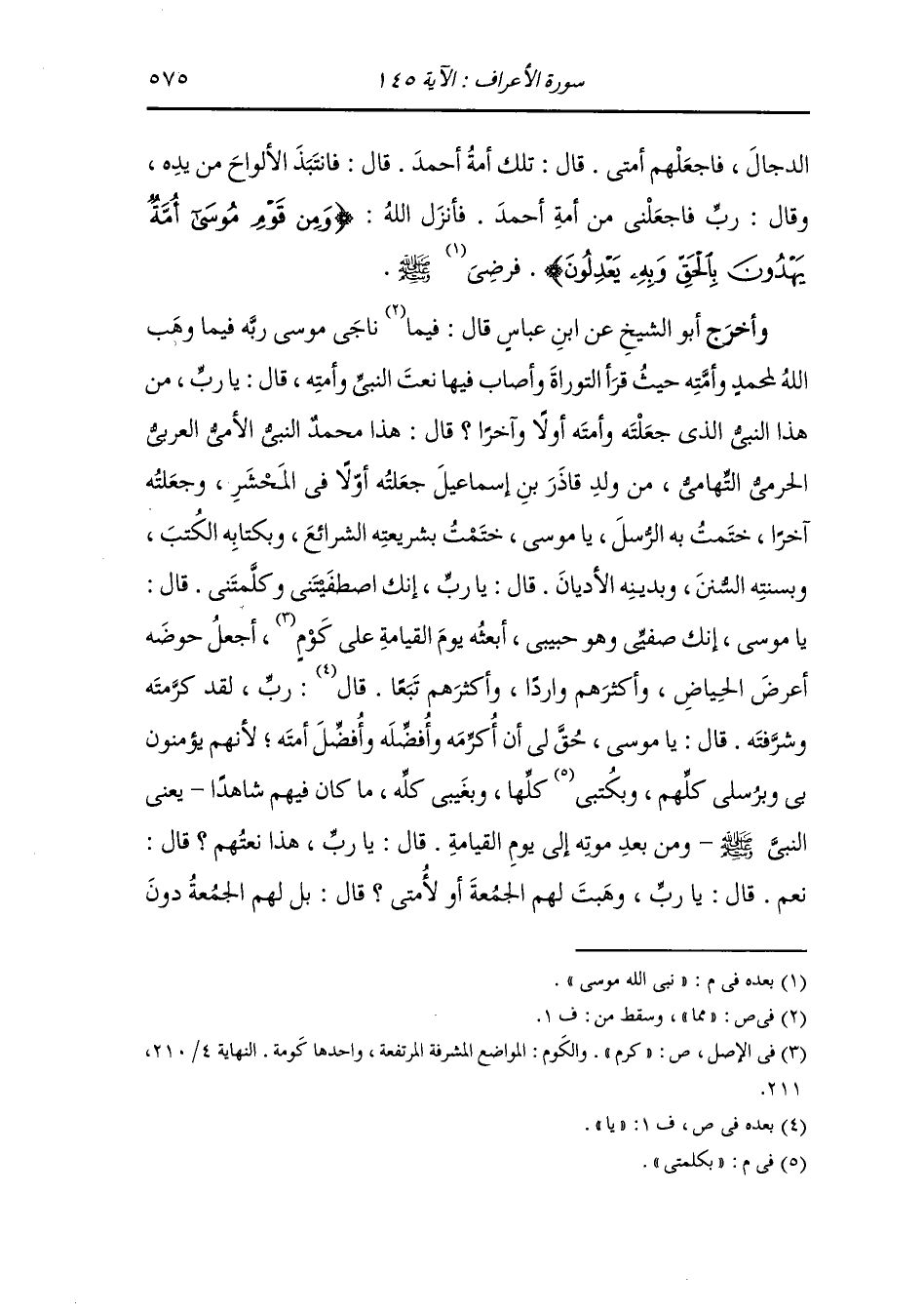 الدجال فاجعلهم أمتي ، قال : تلك أمة أحمد ، قال : فانتبذ الألواح من يده وقال : رب فاجعلني من أمة أحمد ، فأنزل الله {ومن قوم موسى أمة يهدون بالحق وبه يعدلون} الأعراف الآية 159 فرضي نبي الله موسى صلى الله عليه وسلم.