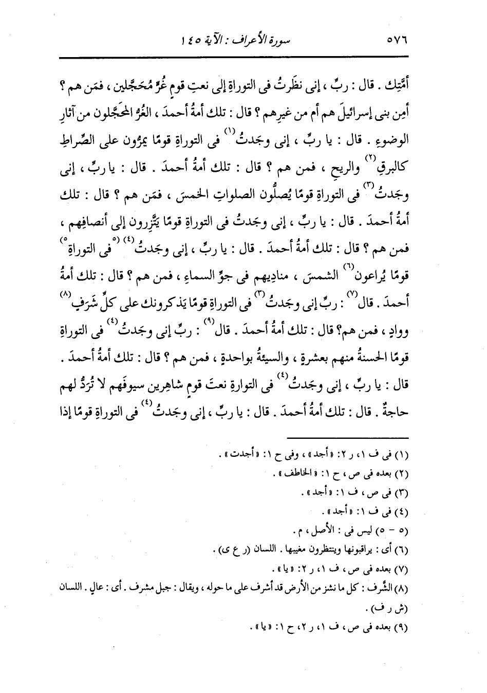 أمتك ، قال : رب إني نظرت في التوراة إلى نعت قوم غر محجلين فمن هم أمن بني إسرائيل هم أم من غيرهم قال : تلك أمة أحمد الغر المحجلون من آثار الوضوء ، قال : يا رب إني وجدت في التوراة قوما يمرون على الصراط كالبرق والريح فمن هم قال : تلك أمة أحمد ، قال : يا رب إني وجدت في التوراة قوما يصلون الصلوات الخمس فمن هم قال : تلك أمة أحمد ، قال : يا رب إني وجدت في التوراة قوما يتزرون إلى أنصافهم فمن هم قال : تلك أمة أحمد ، قال : يا رب إني وجدت قوما يراعون الشمس مناديهم في جو السماء فمن هم قال : تلك أمة أحمد ، قال : رب إني وجدت في التوراة قوما الحسنة منهم بعشرة والسيئة بواحدة فمن هم قال : تلك أمة أحمد ، قال : يا رب إني وجدت في التوراة نعت قوم شاهرين سيوفهم لا ترد لهم حاجة قال : تلك أمة أحمد ، قال : يا رب إني وجدت في التوراة قوما إذا