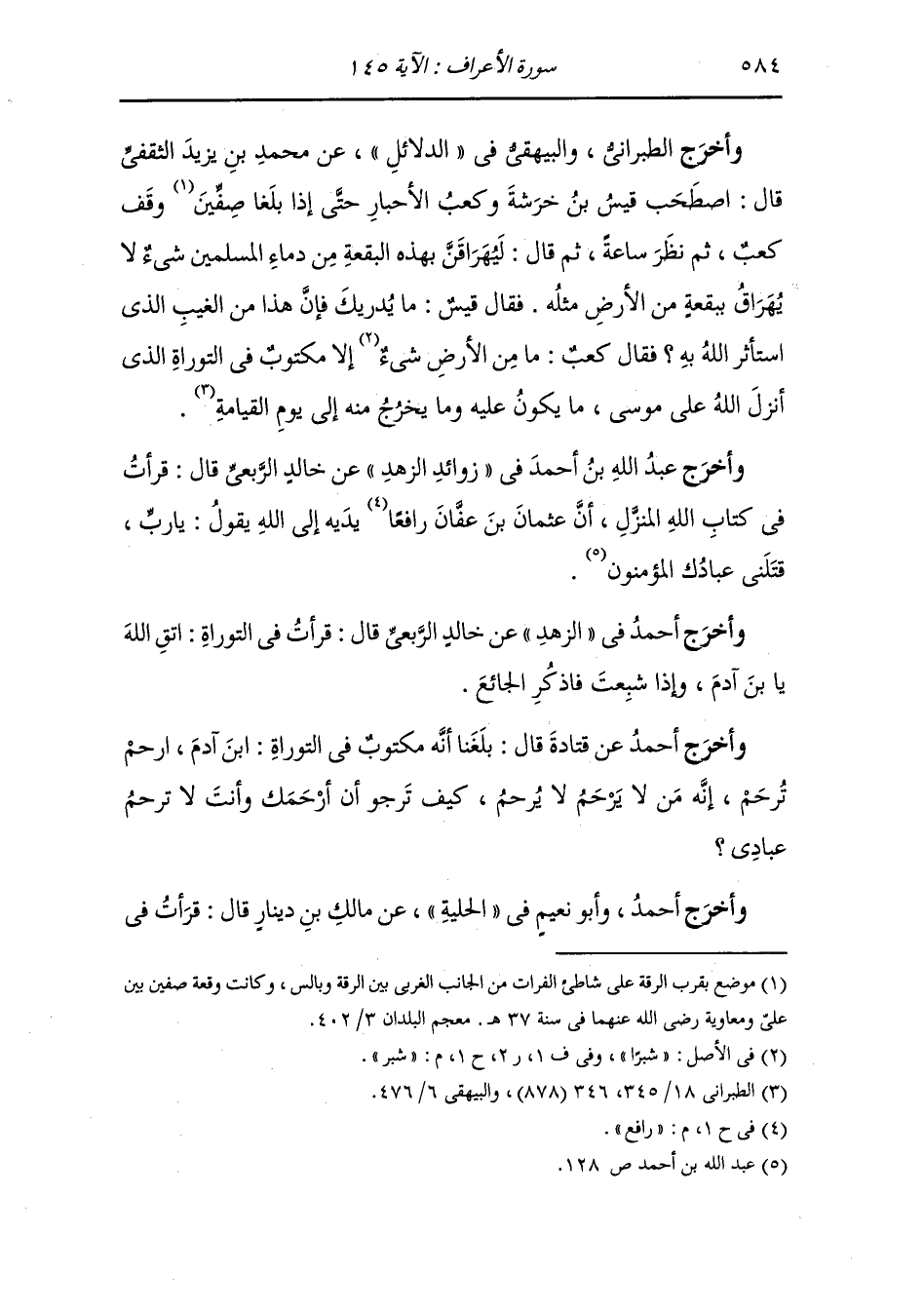 وأخرج الطبراني والبيهقي في الدلائل عن محمد بن يزيد الثقفي قال : اصطحب قيس بن خرشة وكعب الأحبار حتى إذا بلغا صفين وقف كعب ثم نظر ساعة ثم قال : ليهراقن بهذه البقعة من دماء المسلمين شيء لا يهراق ببقعة من الأرض مثله فقال قيس : ما يدريك فإن هذا من الغيب الذي استأثر الله به فقال كعب : ما