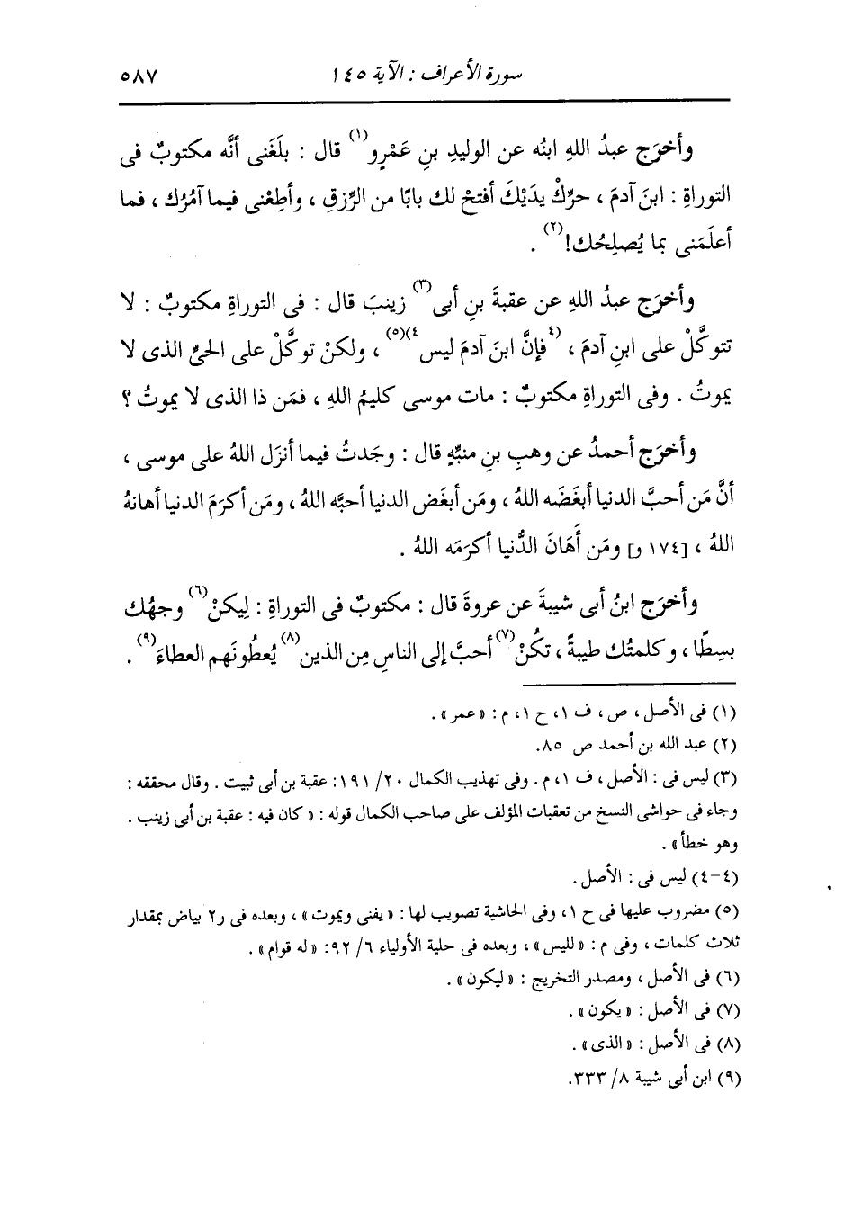 وأخرج عبد الله عن عقبة بن زينب قال : في التوراة مكتوب لا تتوكل على ابن آدم فإن ابن آدم لليس ولكن توكل على الحي الذي لا يموت وفي التوراة مكتوب مات موسى كليم الله فمن ذا الذي لا يموت.