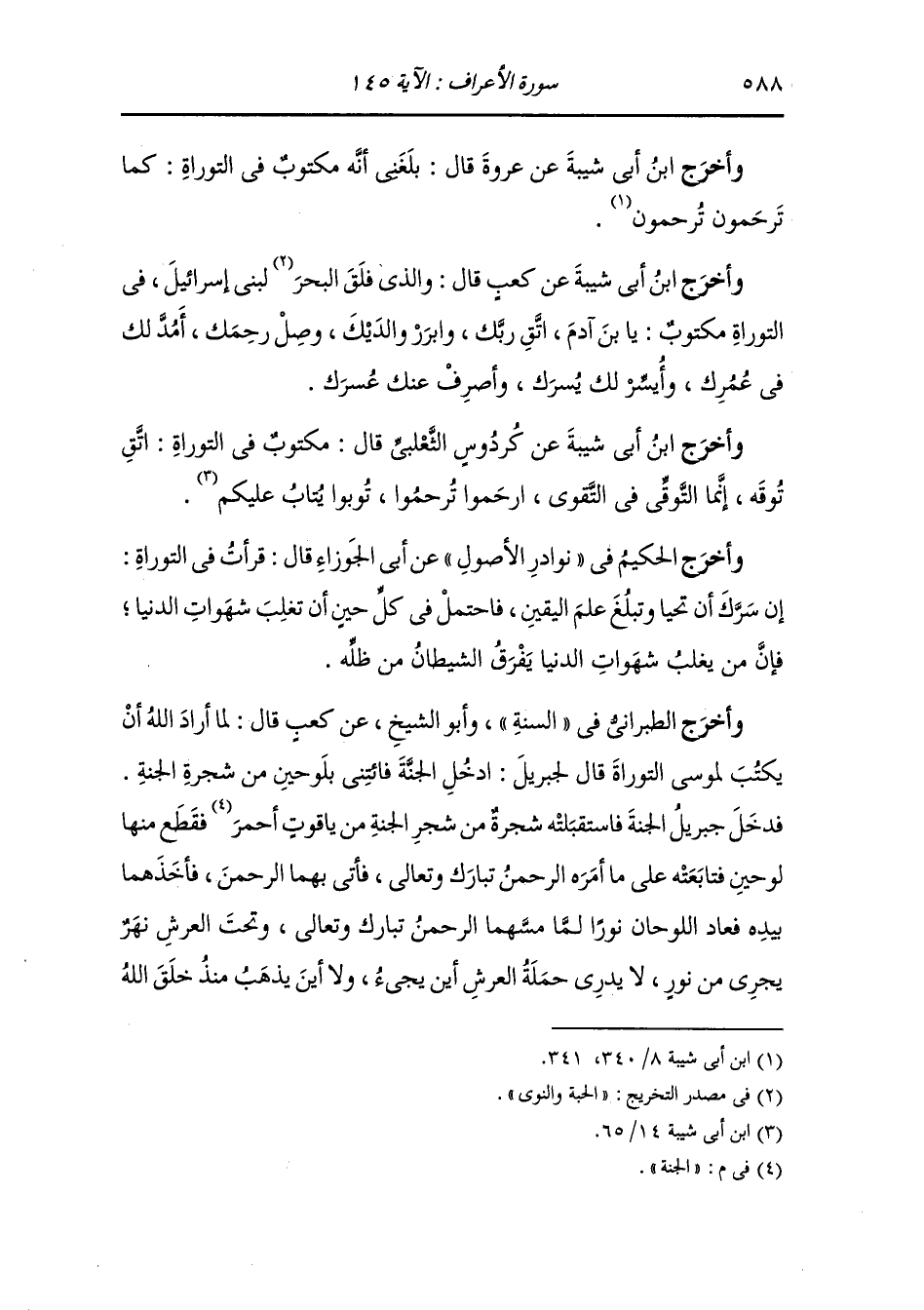 وأخرج الطبراني في السنة وأبو الشيخ عن كعب قال : لما أراد الله أن يكتب لموسى التوراة قال : يا جبريل ادخل الجنة فائتني بلوحين من شجرة الجنة فدخل جبريل الجنة فاستقبلته شجرة من شجر الجنة من ياقوت الجنة فقطع منها لوحين فتابعته على ما أمره الرحمن تبارك وتعالى فأتى بهما الرحمن فأخذهما بيده فعاد اللوحان نورا لما مسهما الرحمن تبارك وتعالى وتحت العرش نهر يجري من نور لا يدري حملة العرش أين يجيء ولا أين يذهب منذ خلق الله