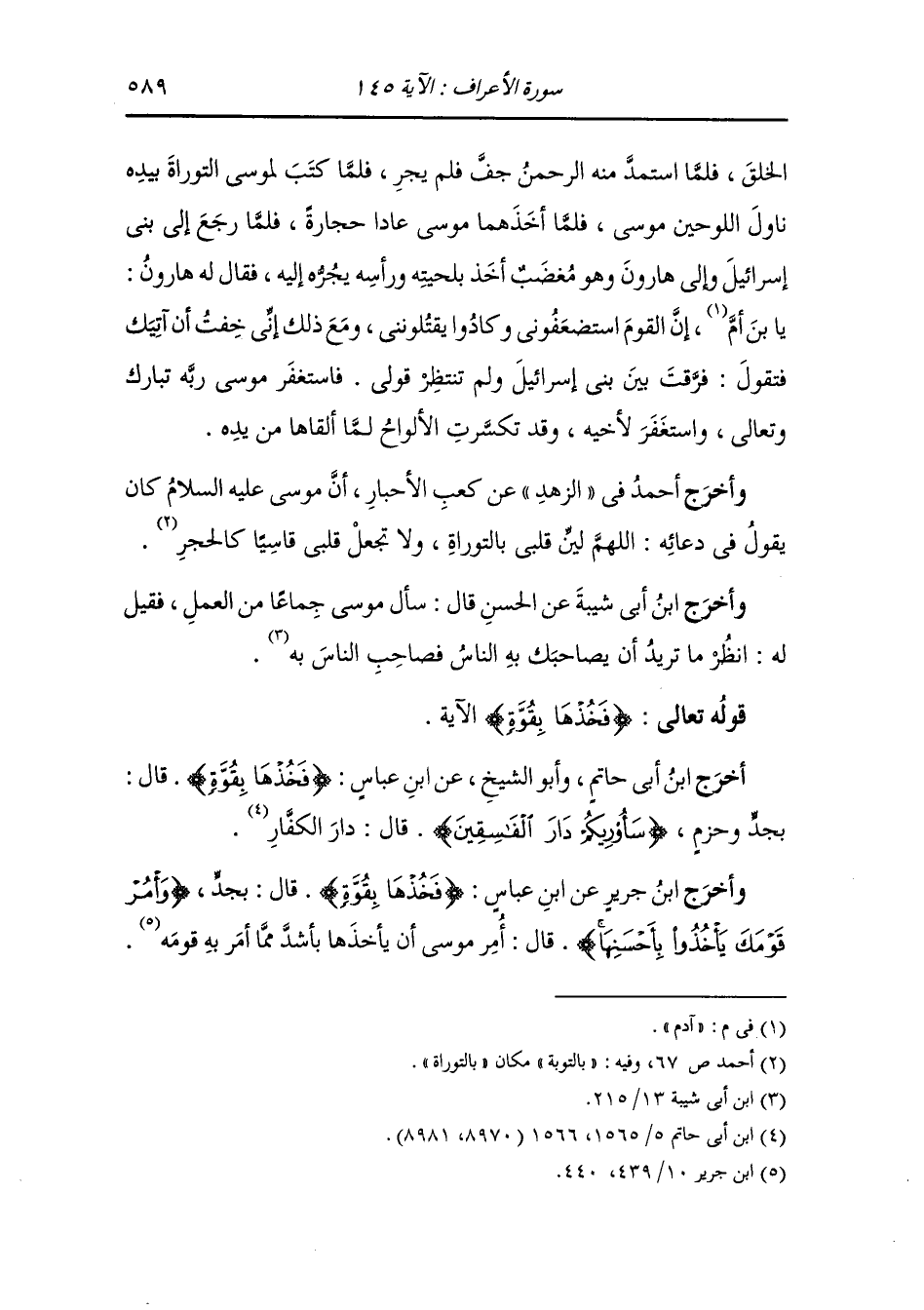 وأخرج ابن جرير عن ابن عباس {فخذها بقوة} قال : بجد {وأمر قومك يأخذوا بأحسنها} قال : أمر موسى أن يأخذها بأشد مما أمر به قومه
