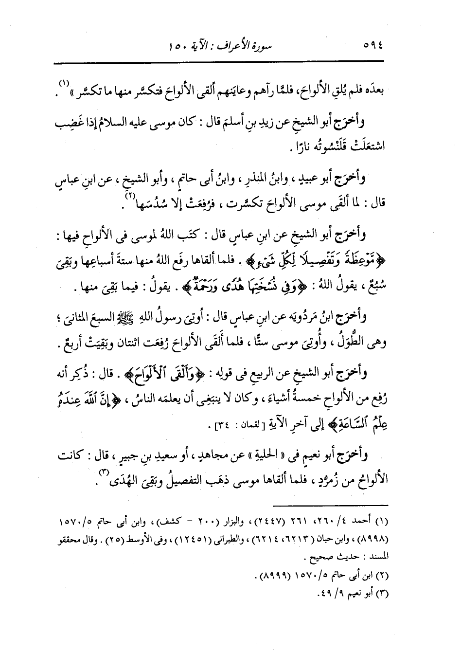 وأخرج أبو الشيخ عن ابن عباس قال : كتب الله لموسى في الألواح فيها {موعظة وتفصيلا لكل شيء} الأعراف الآية 145 فلما ألقاها رفع الله منها ستة أسباعها وبقي سبع يقول الله {وفي نسختها هدى ورحمة} الأعراف الآية 154 يقول : فيما بقي منها.
