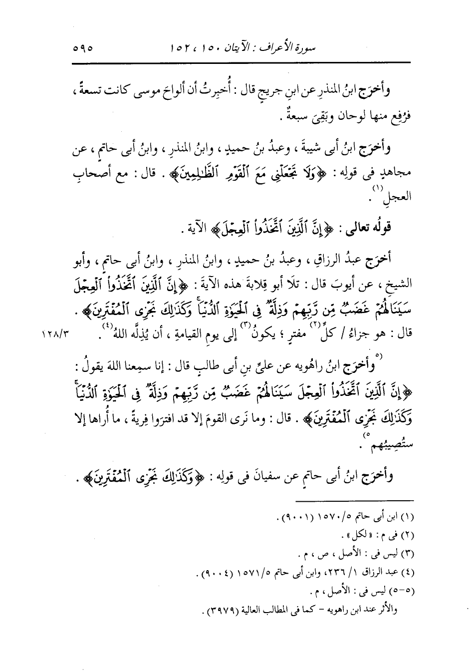 - أَخْرَج عبد الرزاق ، وعَبد بن حُمَيد ، وَابن المنذر ، وَابن أبي حاتم وأبو الشيخ عن أيوب قال : تلا أبو قلابة هذه الآية {إن الذين اتخذوا العجل سينالهم غضب من ربهم وذلة في الحياة الدنيا وكذلك نجزي المفترين} قال : هو جزاء لكل مفتر إلى يوم القيامة أن يذله الله.