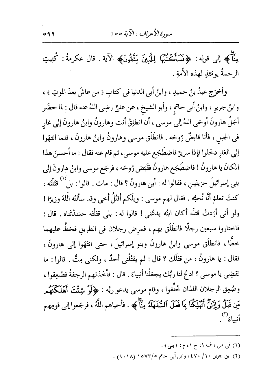 وأخرج عَبد بن حُمَيد ، وَابن أبي الدنيا في كتاب من عاش بعد الموت ، وَابن جَرِير ابن أبي حاتم وأبو الشيخ عن علي رضي الله عنه قال : لما حضر أجل هرون أوحى الله إلى موسى : أن انطلق أنت وهرون ، وَابن هرون إلى غار في الجبل فأنا قابض روحه فانطلق موسى وهرون ، وَابن هرون فلما انتهوا إلى الغار دخلوا فإذا سرير فاضطجع عليه موسى ثم قام عنه فقال : ما أحسن هذا المكان يا هرون فاضطجع هرون فقبض روحه فرجع موسى ، وَابن هرون إلى بني إسرائيل حزينين ، فقالوا له : أين هرون قال : مات ، قالوا : بل قتلته كنت تعلم أنا نحبه ، فقال لهم موسى : ويلكم أقتل أخي وقد سألته الله وزيرا ولو أني أردت قتله أكان ابنه يدعني قالوا له : بلى قتلته حسدتناه ، قال : فاختاروا سبعين رجلا فانطلق بهم فمرض رجلان في الطريق فخط عليهما خطا فانطلق موسى ، وَابن هرون وبنو إسرائيل حتى انتهوا ألى هرون فقال : يا هرون من قتلك قال : لم يقتلني أحد ولكني مت قالوا : ما