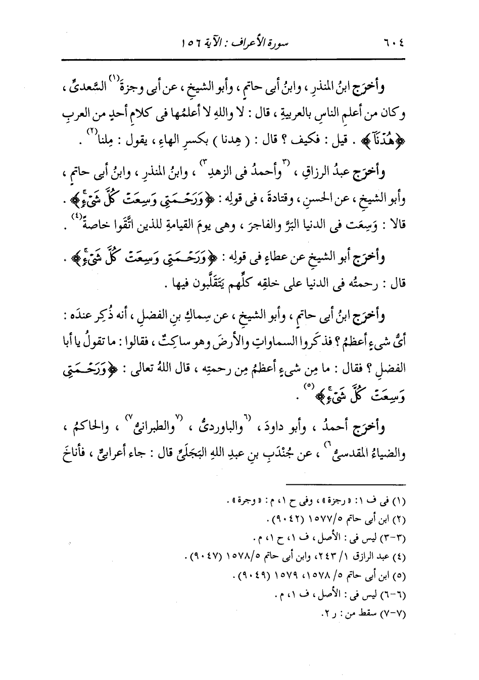 وأخرج ابن أبي حاتم وأبو الشيخ عن سماك بن الفضل ، أنه ذكر عنده أي شيء أعظم فذكروا السموات والأرض وهو ساكت فقالوا : ما تقول يا أبا الفضل فقال : ما من شيء أعظم من رحمته قال الله تعالى {ورحمتي وسعت كل شيء}.