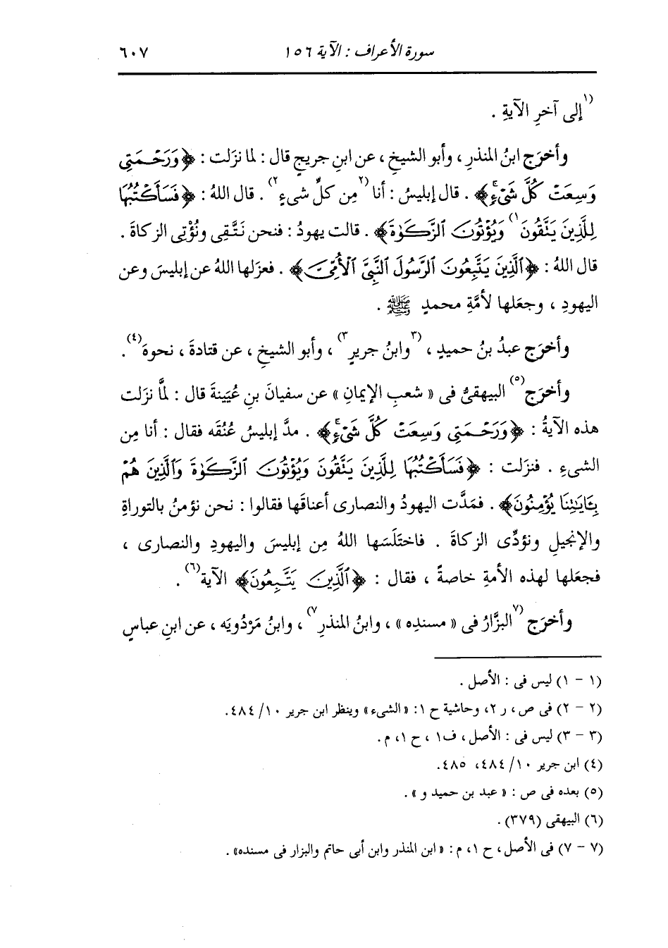 وأخرج البيهقي في الشعب عن سفيان بن عيينة قال : لما نزلت هذه الآية {ورحمتي وسعت كل شيء} مد إبليس عنقه فقال : أنا من الشيء ، فنزلت {فسأكتبها للذين يتقون ويؤتون الزكاة والذين هم بآياتنا يؤمنون} فمدت اليهود والنصارى أعناقها فقالوا : نحن نؤمن بالتوراة والإنجيل ونؤدي الزكاة ، فاختلسها الله من إبليس واليهود والنصارى فجعلها لهذه الأمة خاصة فقال {الذين يتبعون} الآية.