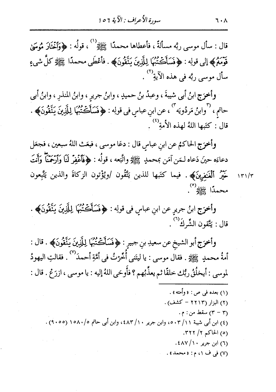 وأخرج الحاكم عن ابن عباس قال : دعا موسى فبعث الله سبعين فجعل دعاءه حين دعاه لمن آمن بمحمد واتبعه قوله {فاغفر لنا وارحمنا وأنت خير الغافرين} {فسأكتبها للذين يتقون ويؤتون الزكاة} والذين يتبعون محمدا.