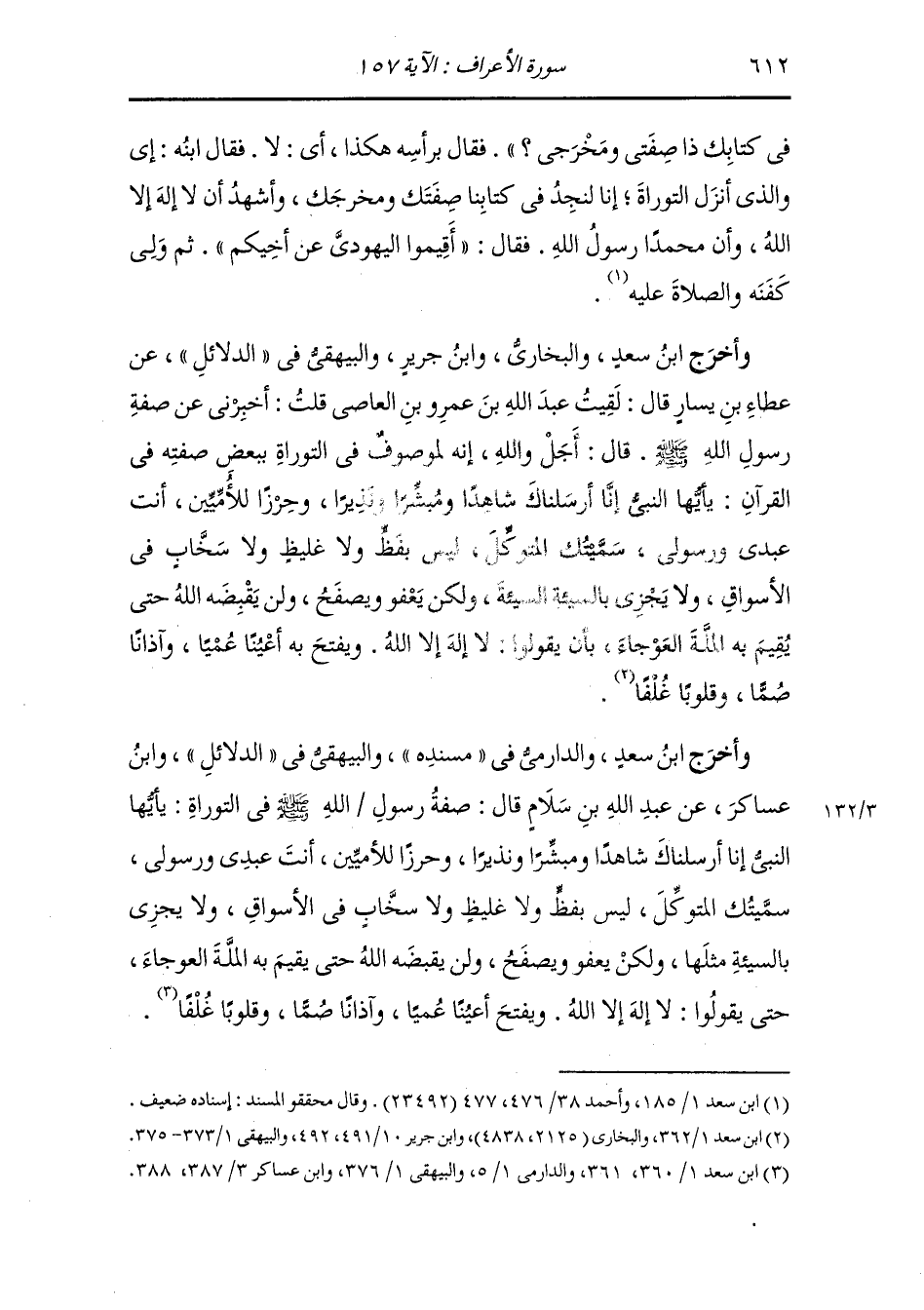 وأخرج ابن سعد والدارمي في مسنده والبيهقي في الدلائل ، وَابن عساكر عن عبد الله بن سلام قال : صفة رسول الله صلى الله عليه وسلم في التوراة {يا أيها النَّبِيّ إنا أرسلناك شاهدا ومبشرا ونذيرا} الأحزاب الآية 45 وحرزا للأميين أنت عبدي ورسولي سميتك المتوكل ليس بفظ ولا غليظ ولا صخاب في الأسواق ولا يجزي بالسيئة مثلها ولكن يعفو