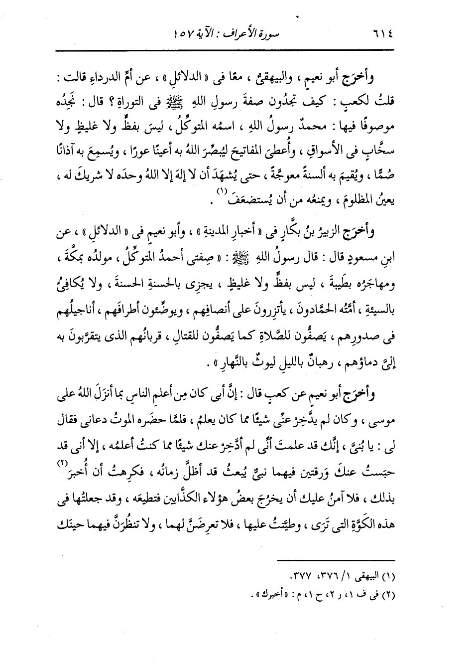 وأخرج الزبير بن بكار في أخبار المدينة وأبو نعيم في الدلائل عن ابن مسعود قال : قال رسول الله صلى الله عليه وسلم صفتي أحمد المتوكل مولده بمكة ومهاجره إلى طيبة ليس بفظ ولا غليظ يجزي بالحسنة الحسنة ولا يكافى ء بالسيئة أمته الحمادون يأتزرون على أنصافهم ويوضئون أطرافهم أناجيلهم في صدورهم يصفون للصلاة كما يصفون للقتال قربانهم الذي يتقربون به إلي دماؤهم رهبان بالليل ليوث بالنهار.