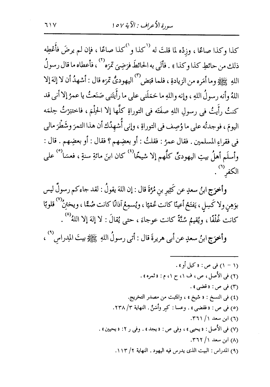 كذا وكذا صاعا وزده لما قلت له كذا وكذا صاعا وزده فإن لم يرض فأعط ذلك من حائط كذا وكذا فأتى بي الحائط فرضي تمره فأعطاه ما قال رسول الله صلى الله عليه وسلم وما أمره من الزيادة فلما قبض اليهودي تمره قال : أشهد أن لا إله إلا الله وأنه رسول الله وإنه والله ما حملني على ما رأيتني صنعت يا عمر إلا أني قد كنت رأيت في رسول الله صفته في التوراة كلها إلا الحلم فاختبرت حلمه اليوم فوجدته على ما وصف في التوراة وإني أشهدك أن هذا التمر وشطر مالي في فقراء المسلمين ، فقال عمر : فقلت : أو بعضهم فقال : أو بعضهم ، قال : وأسلم أهل بيت اليهودي كلهم إلا شيخ كان ابن مائة سنة فعسا على الكفر.