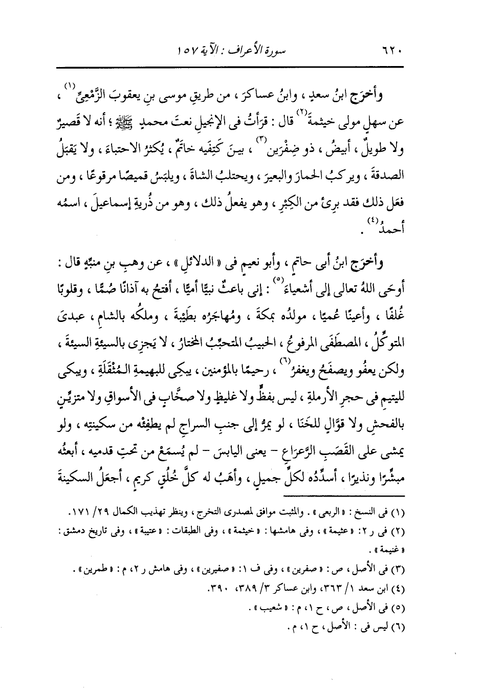 وأخرج ابن سعد ، وَابن عساكر من طريق موسى بن يعقوب الربعي عن سهل مولى خيثمة قال : قرأت في الإنجيل نعت محمد صلى الله عليه وسلم : إنه لا قصير ولا طويل أبيض ذو طمرين بين كتفيه خاتم يكثر الإحتباء ولا يقبل الصدقة ويركب الحمار والبعير ويحتلب الشاة ويلبس قميصا مرقوعا ومن فعل ذلك فقد برى ء من الكبر وهو يفعل ذلك وهو من ذرية إسمعيل عليه السلام.