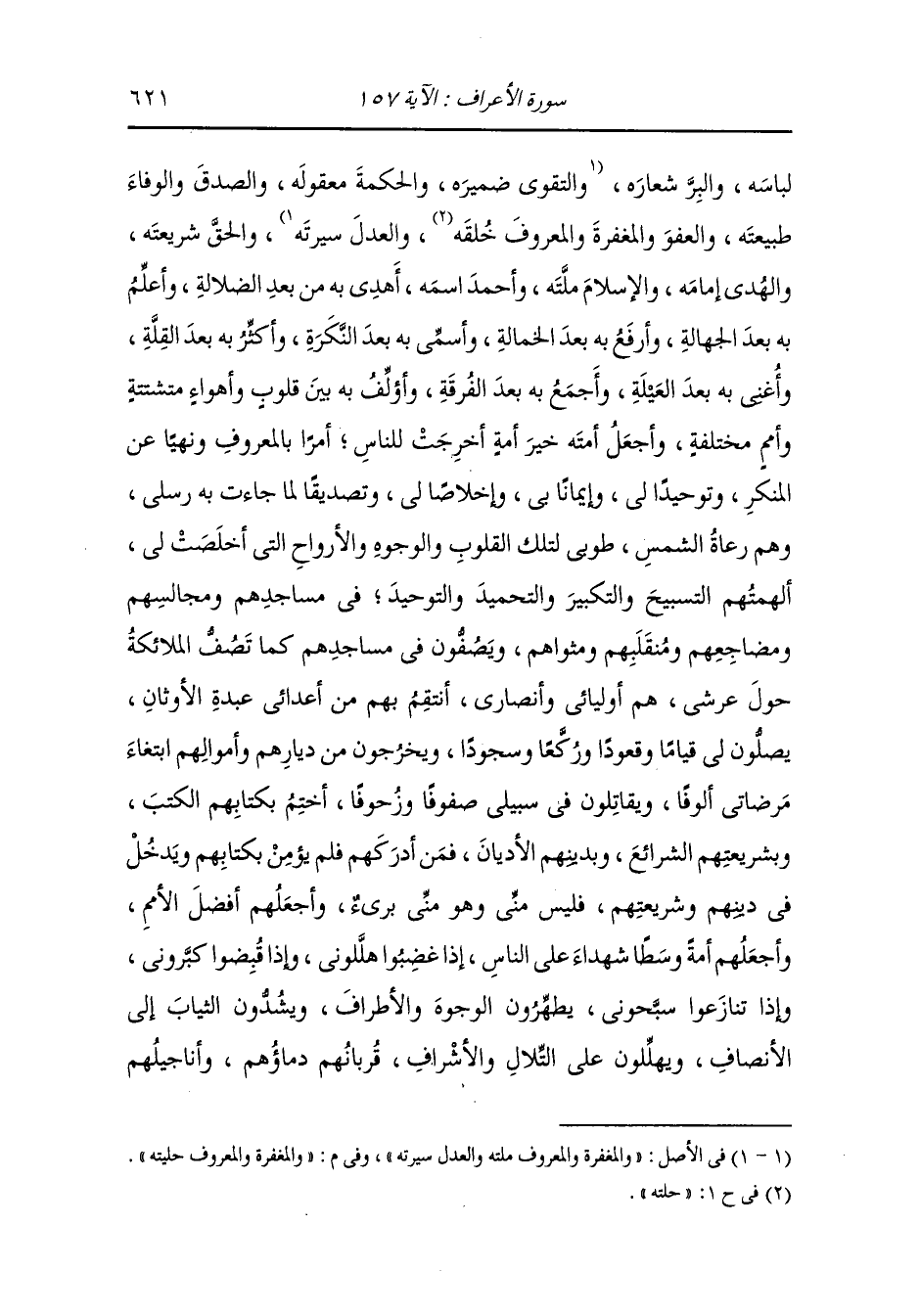 لباسه والبر شعاره والمغفرة والمعروف حليته والحق شريعته والهدى إمامه والإسلام ملته وأحمد اسمه أهدي به من بعد الضلالة وأعلم به بعد الجهالة وأرفع به بعد الخمالة وأسمي به بعد النكرة وأكثر به بعد القلة وأغني به بعد العيلة وأجمع به بعد الفرقة وأؤلف به بين قلوب وأهواء متشتتة وأمم مختلفة وأجعل أمته خير أمة أخرجت للناس أمرا بالمعروف ونهيا عن المنكر وتوحيدا لي وإيمانا بي وإخلاصا لي وتصديقا لما جاءت به رسلي وهم رعاة الشمس ، طوبى لتلك القلوب والوجوه والأرواح التي أخلصت لي ألهمهم التسبيح والتكبير والتمجيد والتوحيد في مساجدهم ومجالسهم ومضاجعهم ومنقلبهم ومثواهم ويصفون في مساجدهم كما تصف الملائكة حول عرشي هم أوليائي وأنصاري أنتقم بهم من أعدائي عبدة الأوثان يصلون لي قياما وقعودا وسجودا ويخرجون من ديارهم وأموالهم ابتغاء مرضاتي ألوفا ويقاتلون في سبيلي صفوفا وزحوفا أختم بكتبهم الكتب وشريعتهم الشرائع وبدينهم الأديان من أدركهم فلم يؤمن بكتابهم ويدخل في دينهم وشريعتهم فليس مني وهو مني بريء وأجعلهم أفضل