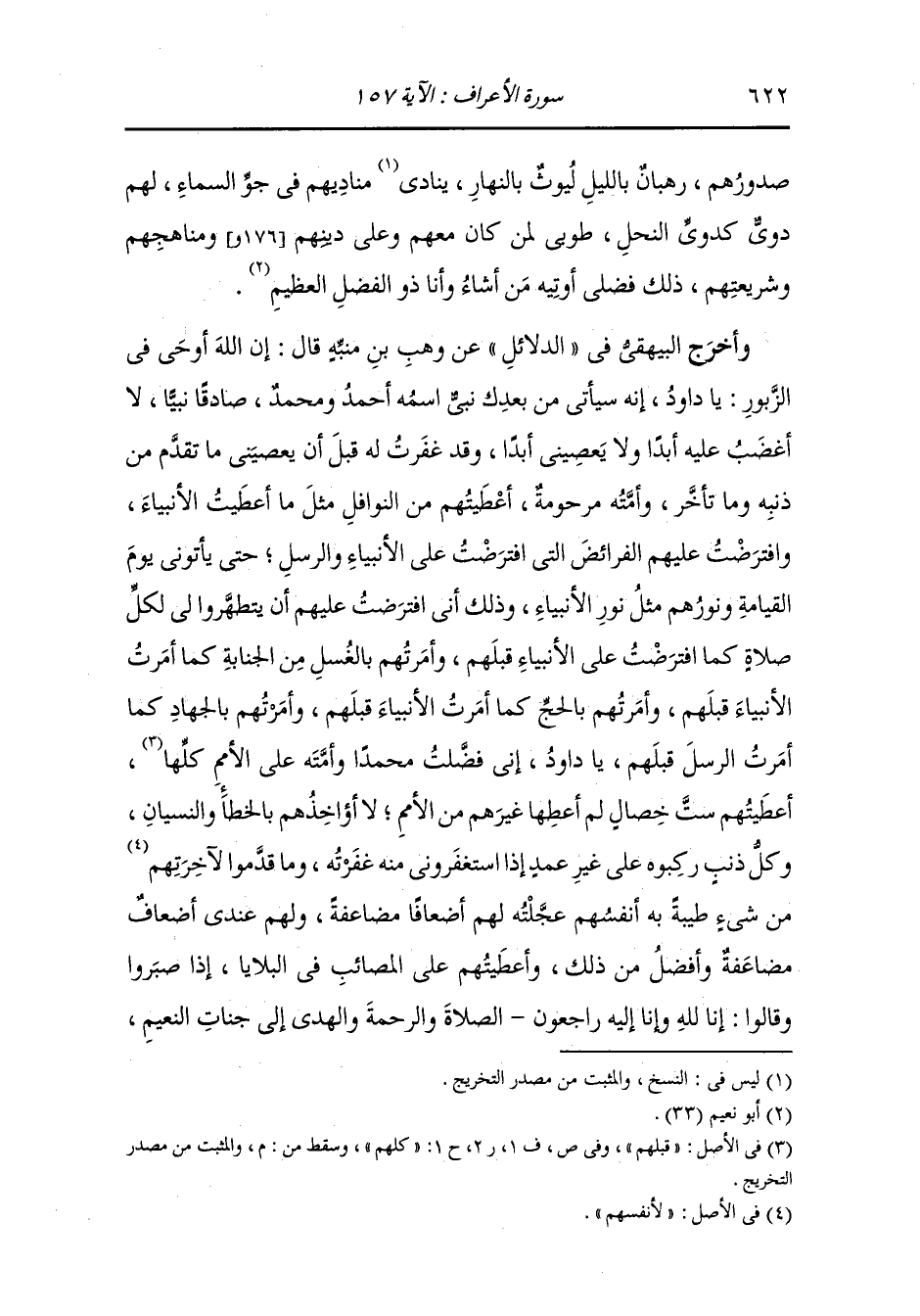 وأخرج البيهقي في الدلائل عن وهب بن منبه قال : إن الله أوحى في الزبور ياداود إنه سيأتي من بعدك نبي اسمه أحمد ومحمد صادقا نبيا لا أغضب عليه أبدا ولا يعصيني أبدا وقد غفرت له أن يعصيني ما تقدم من ذنبه وما تأخر وأمته مرحومة أعطيتهم من النوافل مثل ما أعطيت الأنبياء وافترضت عليهم الفرائض التي افترضت على الأنبياء والرسل حتى يأتوني يوم القيامة ونورهم مثل نور الأنبياء وذلك أني افترضت عليهم أن يتطهروا لي لكل صلاة كما افترضت على الأنبياء قبلهم وأمرتهم بالغسل من الجنابة كما أمرت الأنبياء قبلهم وأمرتهم بالحج كما أمرت الأنبياء قبلهم وأمرتهم بالجهاد كما أمرت الرسل قبلهم ، يا داود إني فضلت محمدا وأمته على الأمم أعطيتهم ست خصال لم أعطيها غيرهم من الأمم ، لا أؤاخذهم بالخطأ والنسيان وكل ذنب ركبوه على غير عمد إذا استغفروني منه غفرته وما قدموا لآخرتهم من شيء طيبة به أنفسهم عجلته لهم أضعافا مضاعفة ولهم عندي أضعاف مضاعفة وأفضل من ذلك وأعطيتهم على المصائب في البلايا إذا صبروا وقالوا إنا لله وإنا إليه راجعون الصلاة والرحمة والهدى إلى جنات النعيم