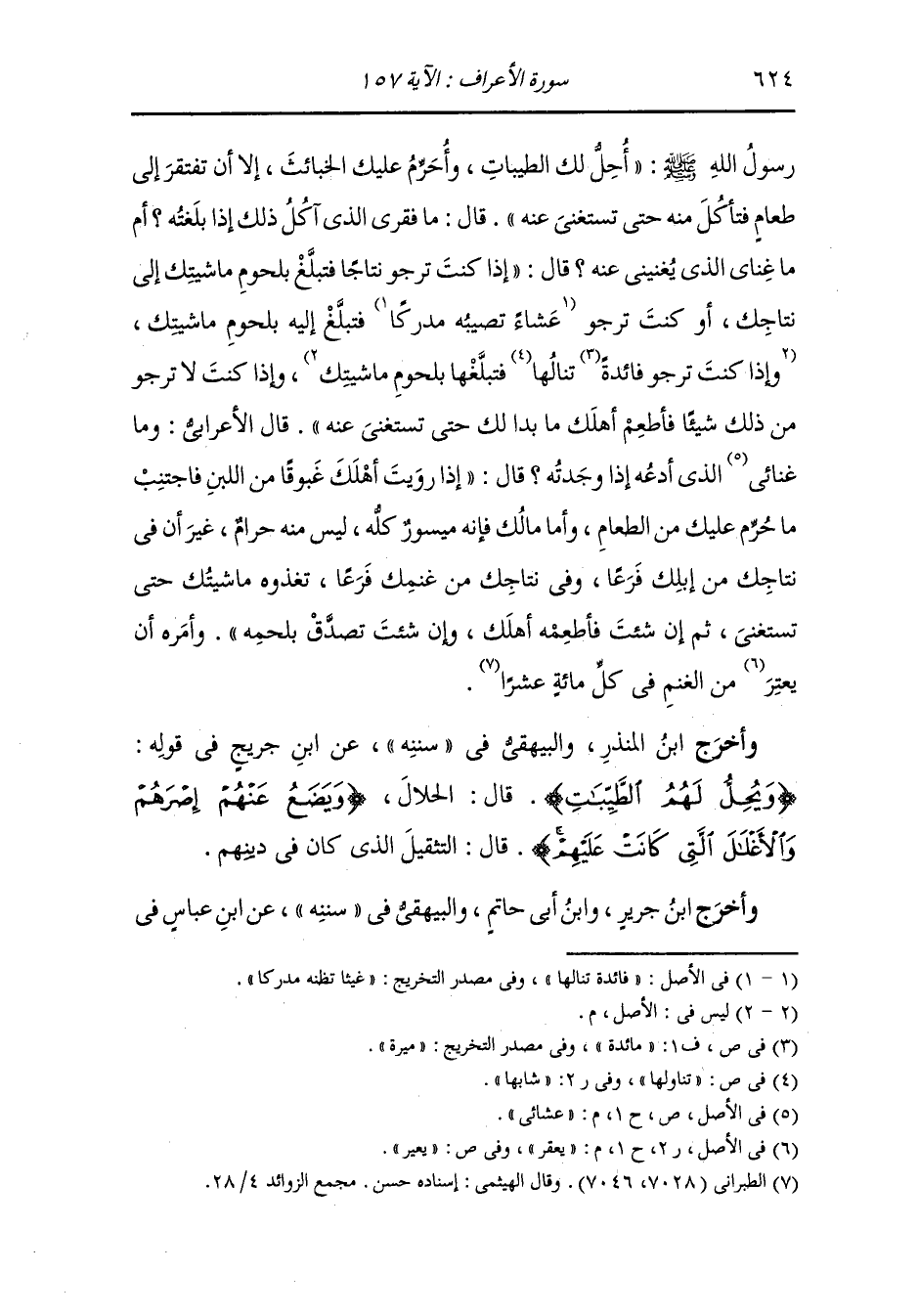 وأخرج ابن المنذر والبيهقي في "سُنَنِه" عن ابن جريج في قوله {ويحل لهم الطيبات} قال : الحلال {ويضع عنهم إصرهم والأغلال التي كانت عليهم} قال : الثقيل الذي كان في دينهم.
