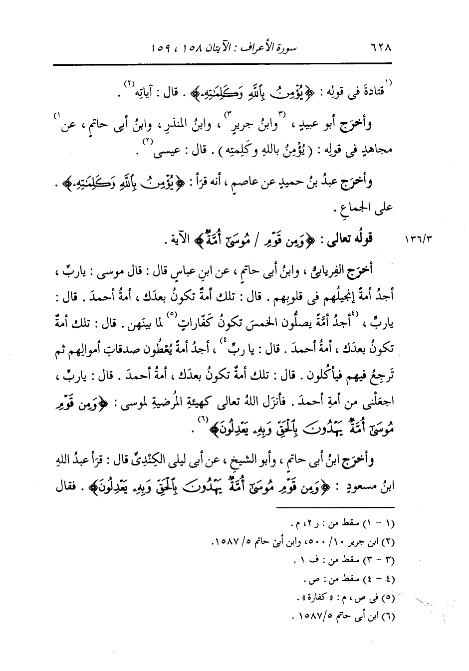 وأخرج الفريابي ، وَابن أبي حاتم عن ابن عباس قال : قال موسى : يا رب أجد أمة إنجيلهم في قلوبهم قال : تلك أمة تكون بعدك أمة أحمد ، قال : يا رب أجد أمة يصلون الخمس تكون كفارة لما بينهن قال : تلك أمة تكون بعدك أمة أحمد ، قال : يا رب أجد أمة يعطون صدقات أموالهم ثم ترجع فيهم فيأكلون قال : تلك أمة تكون بعدك أمة أحمد ، قال : يا رب اجعلني من أمة أحمد ، فأنزل الله كهيئة المرضية لموسى {ومن قوم موسى أمة يهدون بالحق وبه يعدلون}.