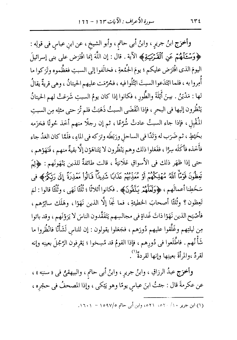 وأخرج ابن جرير ، وَابن أبي حاتم وأبو الشيخ عن ابن عباس في قوله {واسألهم عن القرية} الآية ، قال : إن الله إنما افترض على بني إسرائيل اليوم الذي افترض عليكم يوم الجمعة فخالفوا إلى يوم السبت فعظموه وتركوا ما أمروا به فلما ابتدعوا السبت ابتلوا فيه فحرمت عليهم الحيتان وهي قرية يقال لها مدين أيلة والطور فكانوا إذا كان يوم السبت شرعت لهم الحيتان ينظرون إليها في البحر فإذا انقضى السبت ذهبت فلم تر حتى مثله من السبت المقبل فإذا جاء السبت عادت شرعا ثم إن رجلا منهم أخذ حوتا فحزمه بخيط ثم ضرب له وتدا في الساحل وربطه وتركه في الماء فلما كان الغد جاء فأخذه فأكله سرا ففعلوا ذلك وهم ينظرون ولا يتناهون إلا بقية منهم فنهوهم حتى إذا ظهر ذلك في الأسواق علانية قالت طائفة للذين ينهونهم {لم تعظون قوما الله مهلكهم أو معذبهم عذابا شديدا} قالوا {معذرة إلى ربكم} في سخطنا أعمالهم {ولعلهم يتقون} فكانوا أثلاثا ، ثلثا نهى وثلثا قالوا {لم تعظون} وثلثا أصحاب الخطيئة فما نجا إلا الذين نهوا وهلك سائرهم فأصبح الذين نهوا ذات غداة في مجالسهم يتفقدون الناس لا يرونهم وقد باتوا من ليلتهم وغلقوا عليهم دورهم فجعلوا يقولون : إن للناس شأنا فانظروا ما شأنهم فاطلعوا في دورهم فإذا القوم قد مسخوا يعرفون الرجل بعينه وإنه لقرد والمرأة بعينها وإنها لقردة.