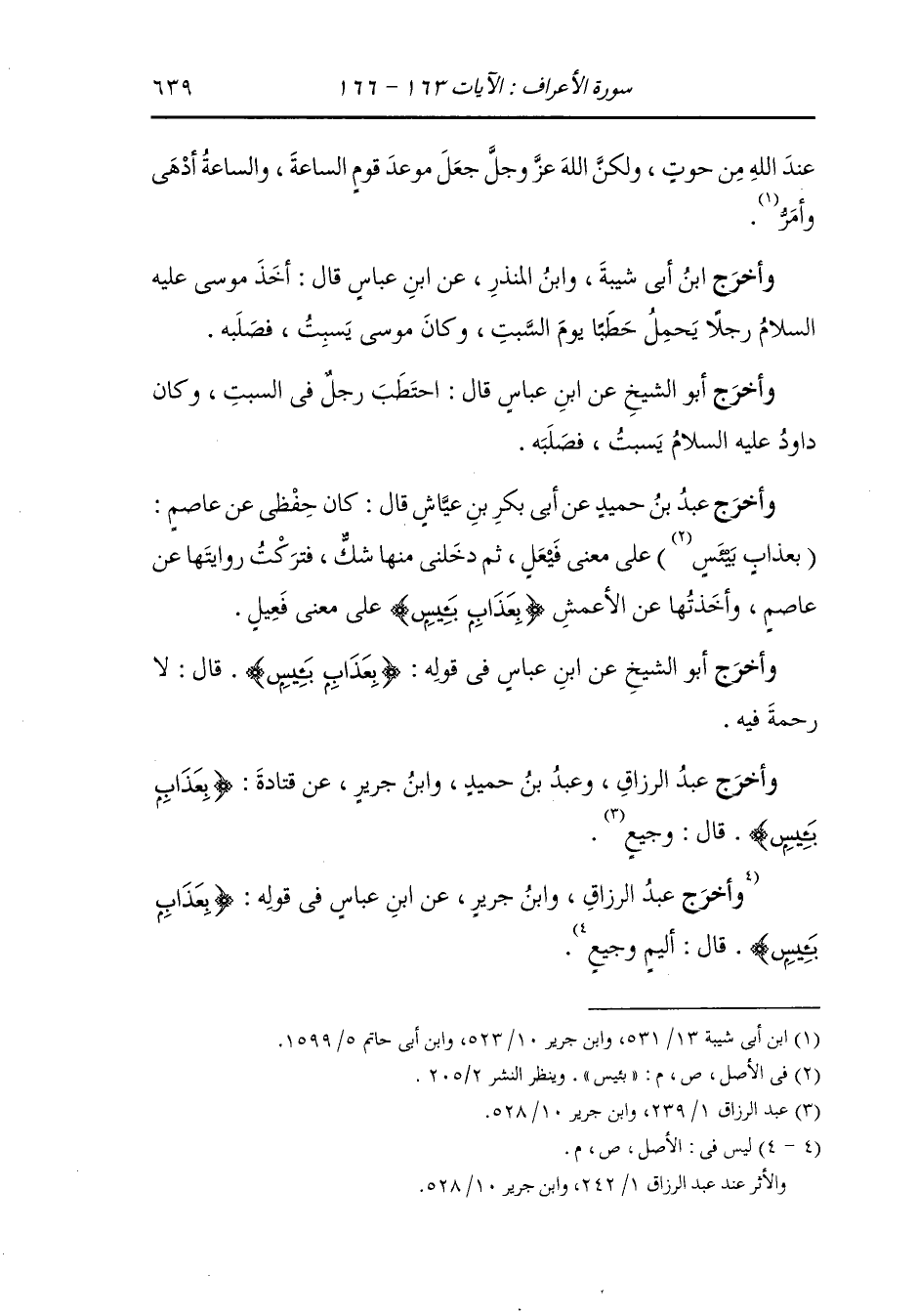 وأخرج عبد الرزاق ، وعَبد بن حُمَيد ، وَابن جَرِير عن قتادة {بعذاب بئيس} قال : وجيع