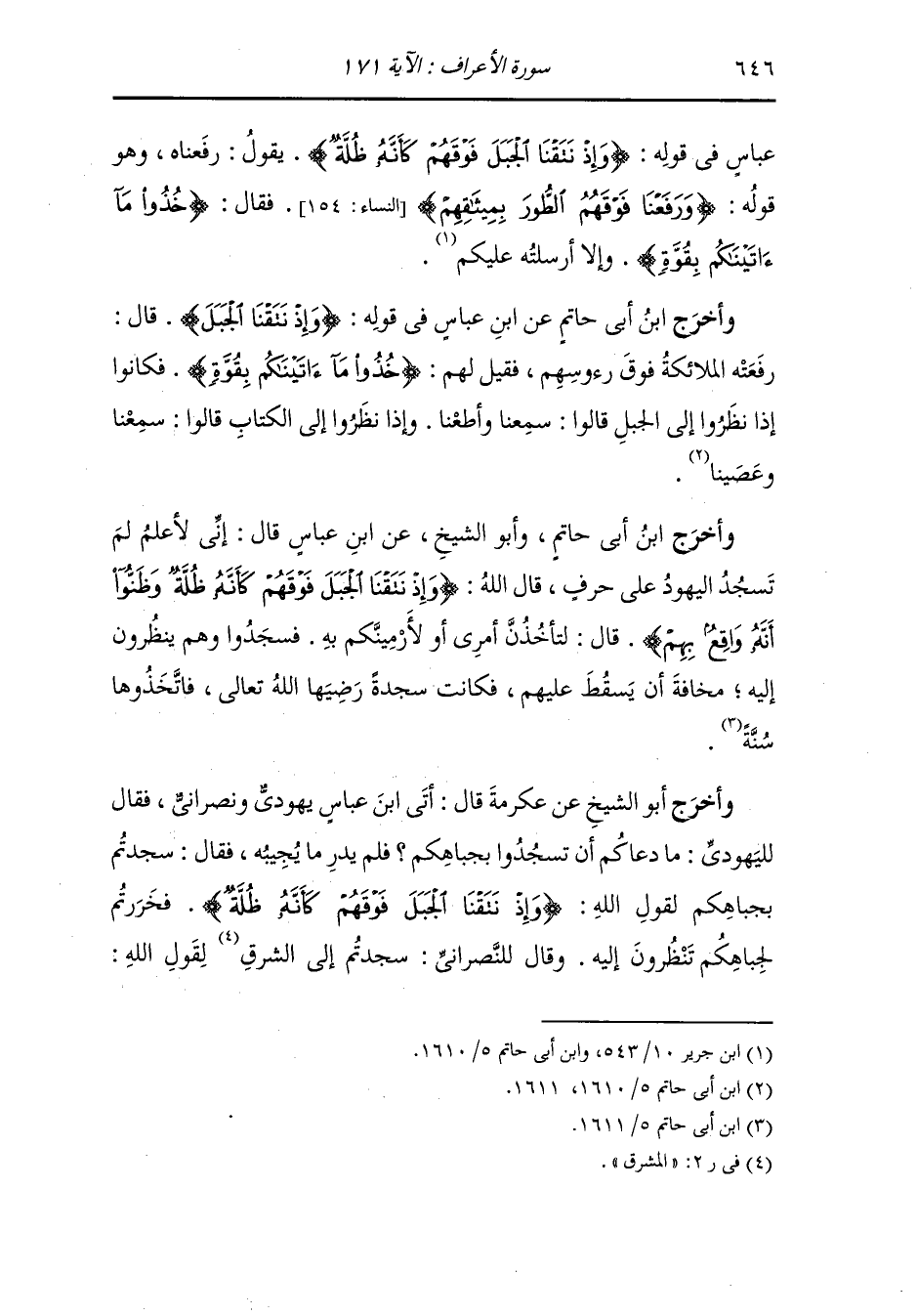 وأخرج ابن أبي حاتم عن ابن عباس في قوله {وإذ نتقنا الجبل} قال : رفعته الملائكة فوق رؤوسهم فقيل لهم {خذوا ما آتيناكم بقوة} فكانوا إذا نظروا إلى الجبل قالوا : سمعنا وأطعنا وإذا نظروا إلى الكتاب قالوا : سمعنا وعصينا.