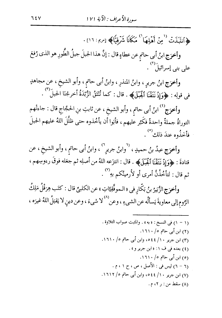 وأخرج ابن جرير ، وَابن المنذر ، وَابن أبي حاتم وأبو الشيخ عن مجاهد في قوله {وإذ نتقنا الجبل} قال : كما تنتق الزبدة أخرجنا الجبل.