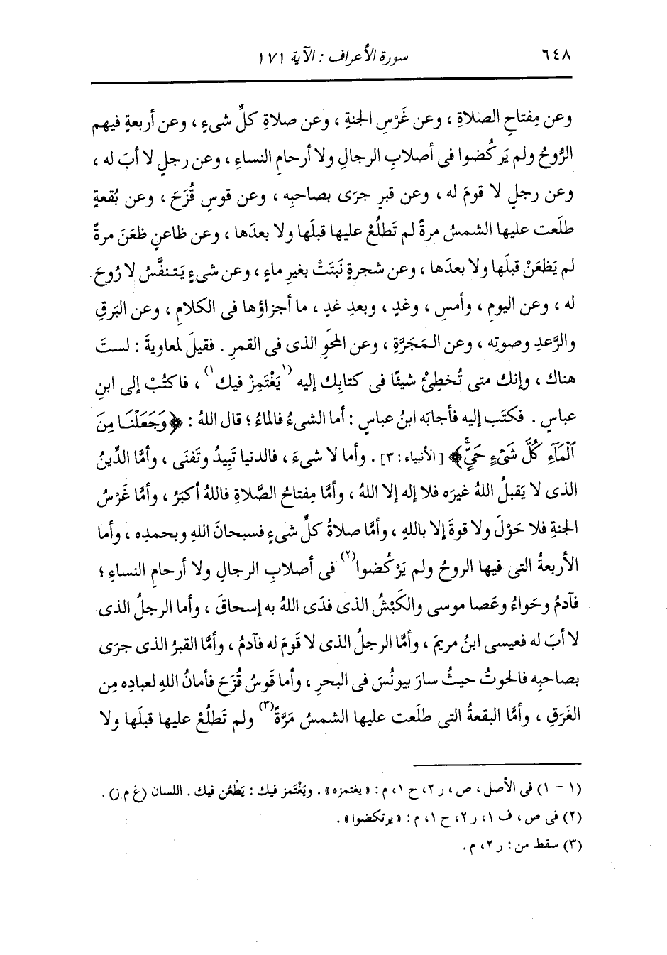وعن مفتاح الصلاة وعن غرس الجنة وعن صلا ة كل شيء وعن أربعة فيهم الروح ولم يركضوا في أصلاب الرجال ولا أرحام النساء وعن رجل لا أب له وعن رجل لا قوم له وعن قبر جرى بصاحبه وعن قوس قزح وعن بقعة طلعت عليها الشمس مرة لم تطلع عليها قبلها ولا بعدها وعن ظاعن ظعن مرة لم يظعن قبلها ولا بعدها وعن شجرة نبتت بغير ماء وعن شيء يتنفس لا روح له وعن اليوم وأمس وغد وبعد غد ما أجزاؤها في الكلام وعن الرعد والبرق وصوته وعن المجرة وعن المحو الذي في القمر فقيل له : لست هناك وإنك متى تخطى ء شيئا في كتابك إليه يغتمزه فيك فاكتب إلى ابن عباس ، فكتب إليه فأجابه ابن عباس : أما الشيء : فالماء قال الله {وجعلنا من الماء كل شيء حي} وأما لا شيء : فالدنيا تبيد وتفني وأما الدين الذي لا يقبل الله غيره : فلا إله إلا الله وأما مفتاح الصلاة : فالله أكبر وأما غرس الجنة ، فلا حول ولا قوة إلا بالله وأما صلاة كل شيء : فسبحان الله وبحمده وأما الأربعة التي فيها الروح ولم يرتكضوا في أصلاب الرجال ولا أرحام