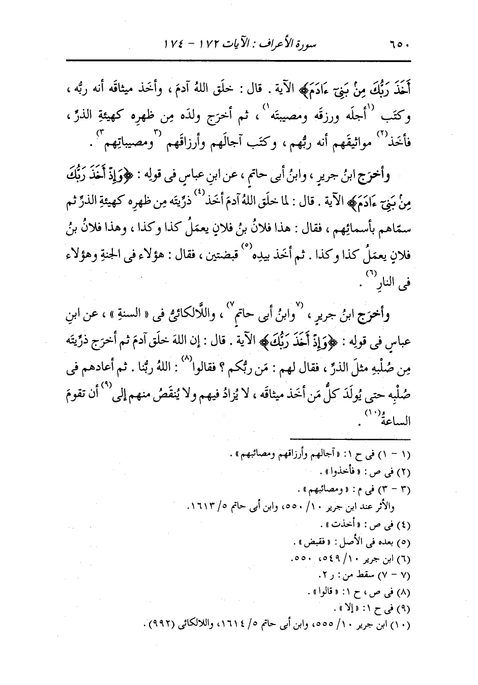 وأخرج ابن جرير ، وَابن أبي حاتم واللالكائي في السنة عن ابن عباس في قوله {وإذ أخذ ربك} الآية ، قال : إن الله خلق آدم ثم أخرج ذريته من صلبه مثل الذر فقال لهم : من ربكم فقالوا : الله ربنا ، ثم أعادهم في صلبه حتى يولد كل من أخذ ميثاقه لا يزاد فيهم ولا ينقص منهم إلى أن تقوم الساعة