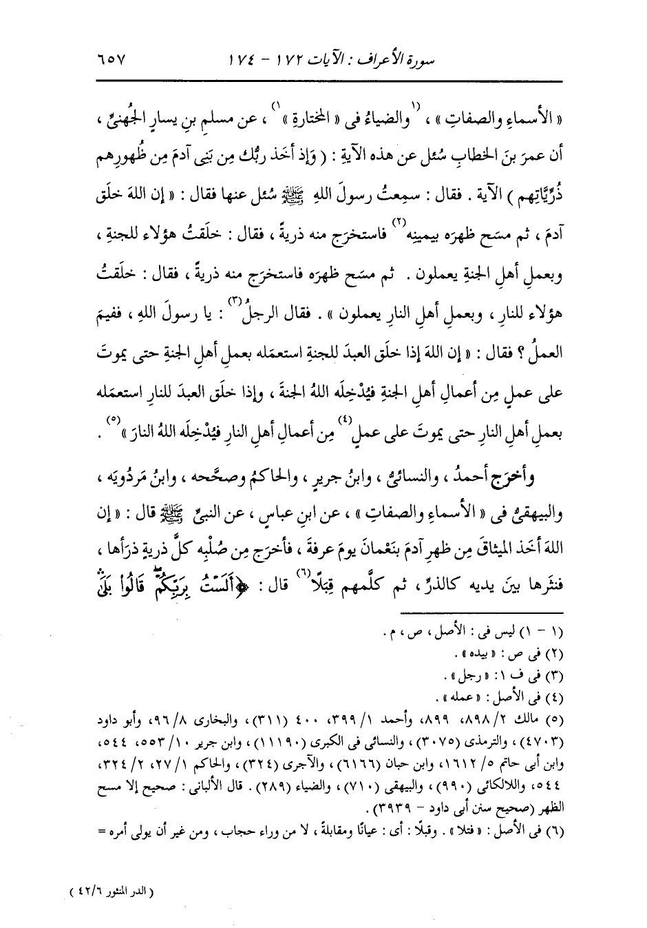 الأسماء والصفات عن مسلم بن يسار الجهني أن عمر بن الخطاب سئل عن هذه الآية {وإذ أخذ ربك من بني آدم من ظهورهم ذريتهم} الآية ، فقال : سمعت رسول الله صلى الله عليه وسلم سئل عنها فقال إن الله خلق آدم ثم مسح ظهره بيمينه فاستخرج منه ذرية فقال : خلقت هؤلاء للجنة وبعمل أهل الجنة يعملون ثم مسح ظهره فاستخرج منه ذرية فقال : خلقت هؤلاء للنار وبعمل أهل النار يعملون ، فقال الرجل : يا رسول الله ففيم العمل فقال : إن الله إذا خلق العبد للجنة استعمله بعمل أهل الجنة حتى يموت على عمل من أعمال أهل الجنة فيدخله الله الجنة وإذا خلق العبد للنار استعمله بعمل أهل النار حتى يموت على عمل من أعمال أهل النار فيدخله الله النار.