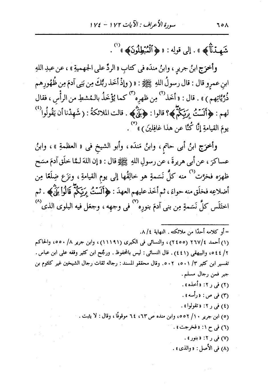 وأخرج ابن جرير ، وَابن منده في كتاب الرد على الجهمية عن عبد الله بن عمرو قال : قال رسول الله صلى الله عليه وسلم {وإذ أخذ ربك من بني آدم من ظهورهم ذريتهم} قال أخذ من ظهره كما يؤخذ بالمشط من الرأس ، فقال لهم {ألست بربكم قالوا بلى} قالت الملائكة {شهدنا أن تقولوا يوم القيامة إنا كنا عن هذا غافلين}.