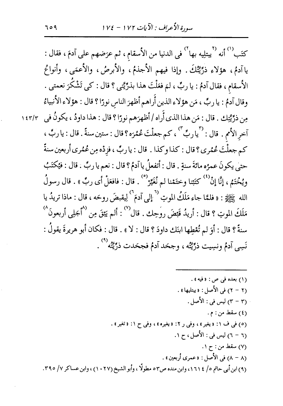 تشكر نعمتي ، وقال آدم : يا رب من هؤلاء الذين أراهم أظهر الناس نورا قال : هؤلاء الأنبياء من ذريتك ، قال : من هذا الذي أراه أظهرهم نورا قال : هذا داود يكون في آخر الأمم ، قال : يا رب كم جعلت عمره قال : ستين سنة ، قال : يا رب كم جعلت عمري قال : كذا وكذا ، قال : يا رب فزده من عمري أربعين سنة حتى يكون عمره مائة سنة ، قال : أتفعل يا آدم قال : نعم يا رب ، قال : فيكتب ويختم أنا كتبنا وختمنا ولم نغير ، قال : فافعل أي رب ، قال رسول الله صلى الله عليه وسلم : فلما جاء ملك الموت إلى آدم ليقبض روحه قال : ماذا تريد يا ملك الموت قال : أريد قبض روحك ، قال : ألم يبق من أجلي أربعون سنة قال : أو لم تعطها ابنك داود قال : لا ، قال : فكان أبو هريرة يقول : نسي آدم ونسيت ذريته وجحد آدم فجحدت ذريته