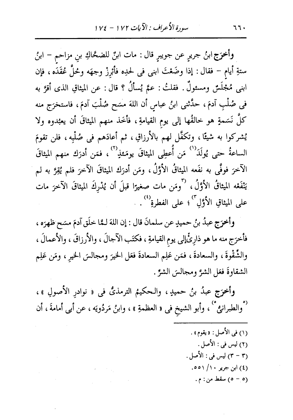 وأخرج ابن جرير عن جويبر قال : مات ابن الضحاك بن مزاحم ابن ستة أيام فقال : إذا وضعت ابني في لحده فأبرز وجهه وحل عقده فإن ابني مجلس ومسؤول ، فقلت : عم يسأل قال : عن ميثاق الذي أقر به في صلب آدم حدثني ابن عباس : أن الله مسح صلب آدم فاستخرج منه كل نسمة هو خالقها إلى يوم القيامة فأخذ منهم الميثاق أن يعبدوه ولا يشركوا به شيئا وتكفل لهم بالأرزاق ثم أعادهم في صلبه فلن تقوم الساعة حتى يولد من أعطى الميثاق يومئذ فمن أدرك منهم الميثاق الآخر فوفى به نفعه الميثاق الأول ومن أدرك الميثاق الآخر فلم يقر به لم ينفعه الميثاق الأول ومن مات صغيرا قبل أن يدرك الميثاق الآخر مات على الميثاق الأول على الفطرة.