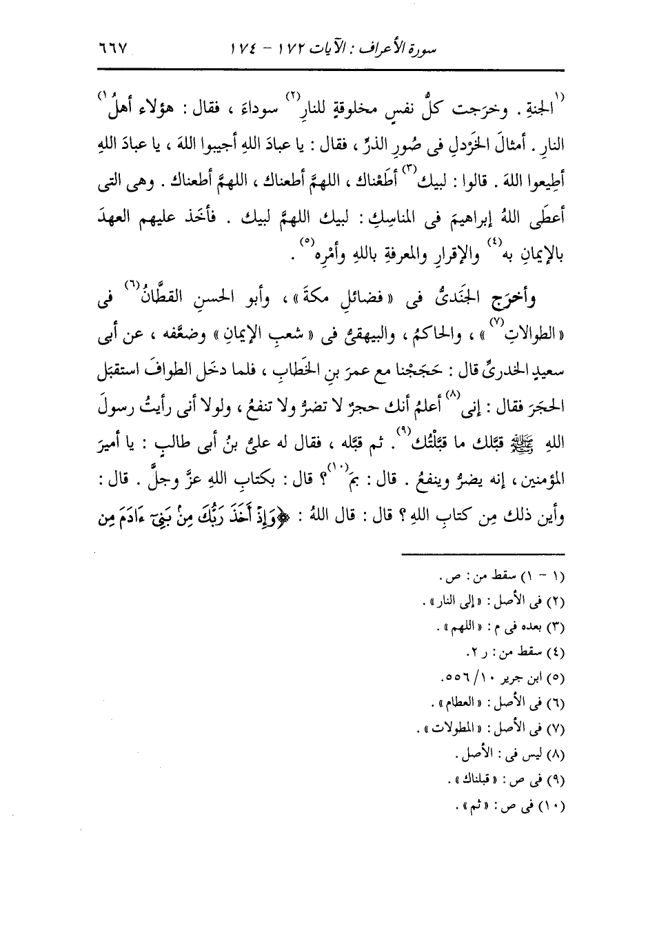 وأخرج الجندي في فضائل مكة وأبو الحسن القطان في الطوالات والحاكم والبيهقي في شعب الإيمان وضعفه عن أبي سعيد الخدري قال : حججنا مع عمر بن الخطاب فلما دخل الطواف استقبل الحجر فقال : إني أعلم أنك حجر لا تضر ولا تنفع ولولا أني رأيت رسول الله صلى الله عليه وسلم قبلك ما قبلتك ثم قبله فقال له علي بن أبي طالب : يا أمير المؤمنين إنه يضر وينفع قال : بم ، قال : بكتاب الله عز وجل قال : وأين ذلك من كتاب الله قال الله {وإذ أخذ ربك من بني آدم من