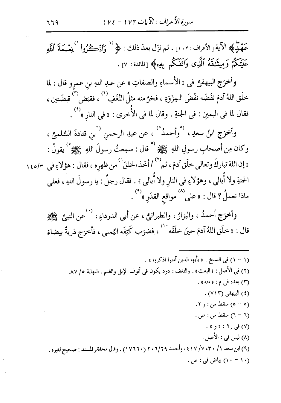 وأخرج ابن سعد وأحمد عن عبد الرحمن بن قتادة السلمي وكان من أصحاب رسول الله صلى الله عليه وسلم قال : سمعت رسول الله صلى الله عليه وسلم يقول إن الله تبارك وتعالى خلق آدم ثم أخذ الخلق من ظهره فقال : هؤلاء في الجنة ولا أبالي وهؤلاء في النار ولا أبالي ، فقال رجل : يا رسول الله فعلى ماذا نعمل قال : على مواقع القدر.