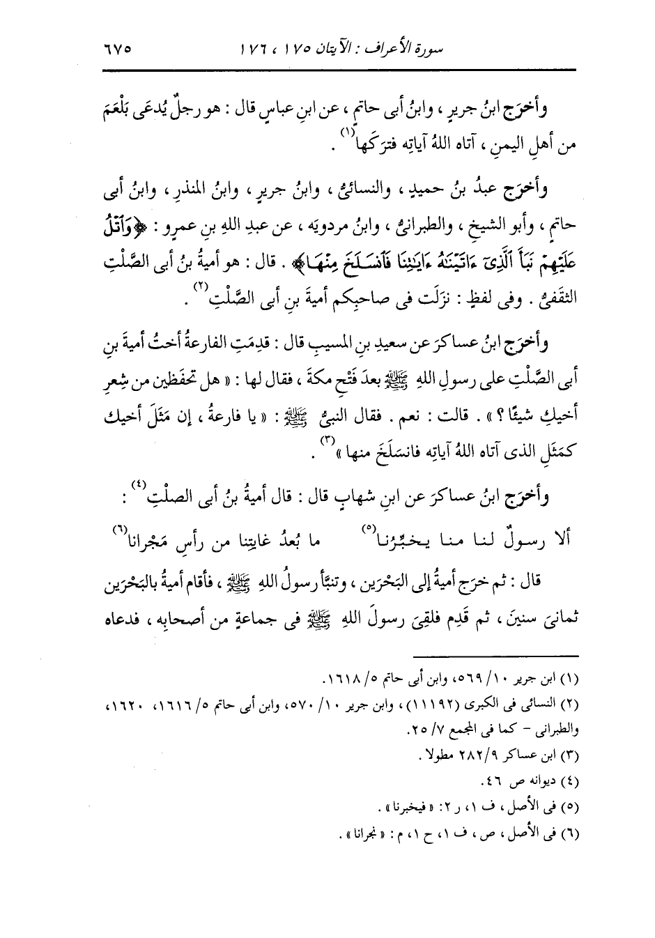 وأخرج عَبد بن حُمَيد والنسائي ، وَابن جَرِير ، وَابن المنذر ، وَابن أبي حاتم وأبو الشيخ والطبراني ، وَابن مردويه عن عبد الله بن عمر {واتل عليهم نبأ الذي آتيناه آياتنا فانسلخ منها} قال : هو أمية بن أبي الصلت الثقفي ، وفي لفظ : نزلت في صاحبكم أمية بن أبي الصلت.
