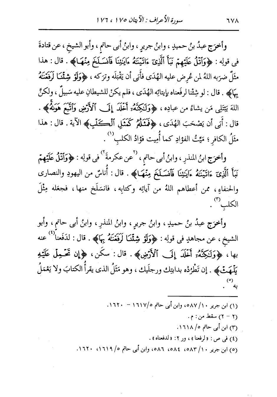 وأخرج عَبد بن حُمَيد ، وَابن جَرِير ، وَابن أبي حاتم وأبو الشيخ عن قتادة في قوله {واتل عليهم نبأ الذي آتيناه آياتنا فانسلخ منها} قال : هذا مثل ضربه الله لمن عرض عليه الهدى فأبى أن يقبله وتركه {ولو شئنا لرفعناه بها} قال : لو شئنا لرفعناه بإيتائه الهدى فلم يكن للشيطان عليه سبيل ولكن الله يبتلي من يشاء من عباده {ولكنه أخلد إلى الأرض واتبع هواه} قال : أبى أن يصحب الهدى {فمثله كمثل الكلب} الآية ، قال : هذا مثل الكافر ميت الفؤاد كما أميت فؤاد الكلب.