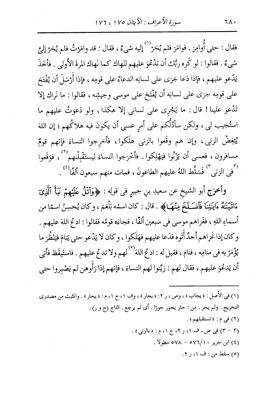 قال : كان اسمه بلعم وكان يحسن إسما من أسماء الله فغزاهم موسى في سبعين ألفا فجاءه قومه فقالوا : ادع الله عليهم - وكانوا إذا غزاهم أحد أتوه فدعا عليهم فهلكوا - وكان لا يدعو حتى ينام فينظر ما يؤمر به في منامه فنام فقيل له : ادع الله لهم ولا تدع عليهم فاستيقظ فأبى أن يدعو عليهم فقال لهم : زينوا لهم النساء فإنهم إذا رأوهن لم يصبروا حتى