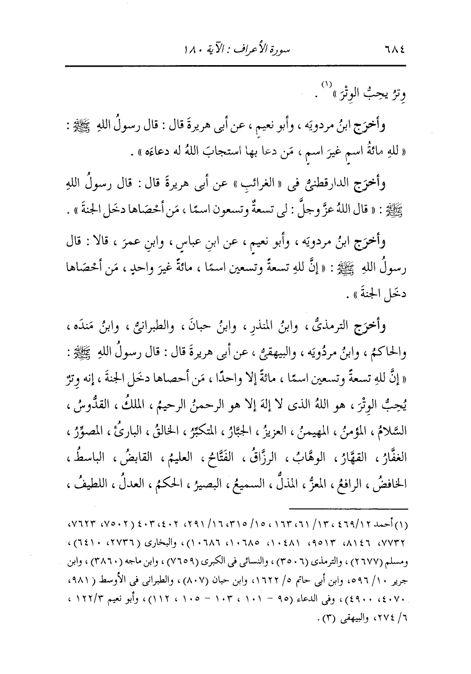 وأخرج الترمذي ، وَابن المنذر ، وَابن حبان ، وَابن منده والطبراني والحاكم ، وَابن مردويه والبيهقي عن أبي هريرة قال : قال رسول الله صلى الله عليه وسلم إن لله تسعة وتسعين اسما مائة إلا واحدا من أحصاها دخل الجنة إنه وتر يحب الوتر هو الله الذي لا إله إلا هو الرحمن الرحيم الملك القدوس السلام المؤمن المهيمن العزيز الجبار المتكبر الخالق البارى ء المصور الغفار القهار الوهاب الرزاق الفتاح العليم القابض الباسط الخافض الرافع المعز المذل السميع البصير الحكم العدل اللطيف