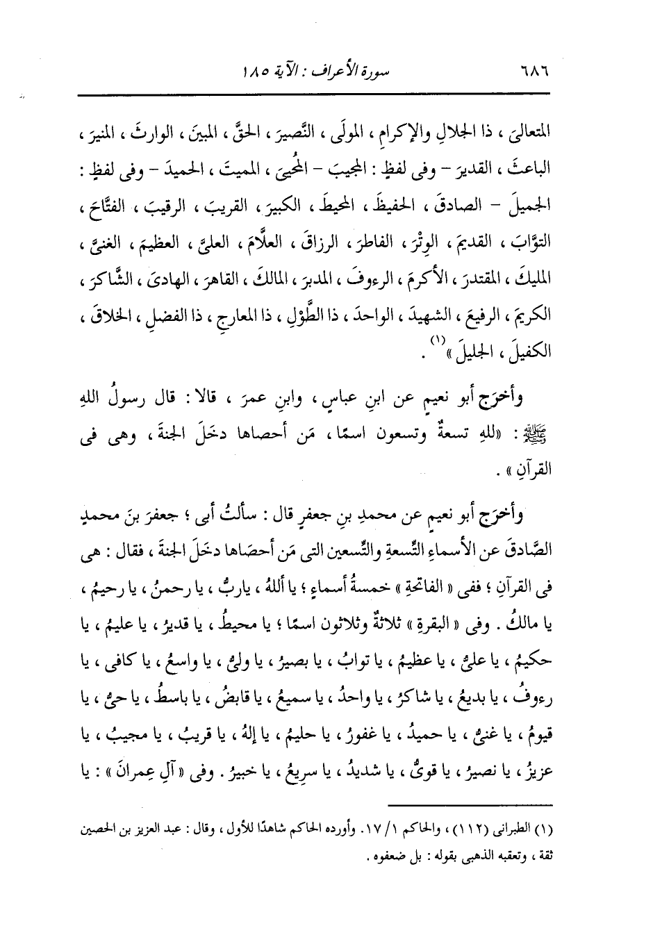 وأخرج أبو نعيم عن محمد بن جعفر قال : سألت أبي جعفر بن محمد الصادق عن الأسماء التسعة والتسعين التي من أحصاها دخل الجنة فقال : هي في القرآن ففي الفاتحة خمسة أسماء ، يا ألله يا رب يا رحمن يا رحيم يا مالك ، وفي البقرة ثلاثة وثلاثون اسما : يا محيط يا قدير يا عليم يا حكيم يا علي يا عظيم يا تواب يا بصير يا ولي يا واسع يا كافي يا رؤوف يا بديع يا شاكر يا واحد يا سميع يا قابض يا باسط يا حي يا قيوم يا غني يا حميد يا غفور يا حليم يا إله يا قريب يا مجيب يا عزيز يا نصير يا قوي يا شديد يا سريع يا خبير ، وفي آل عمران :