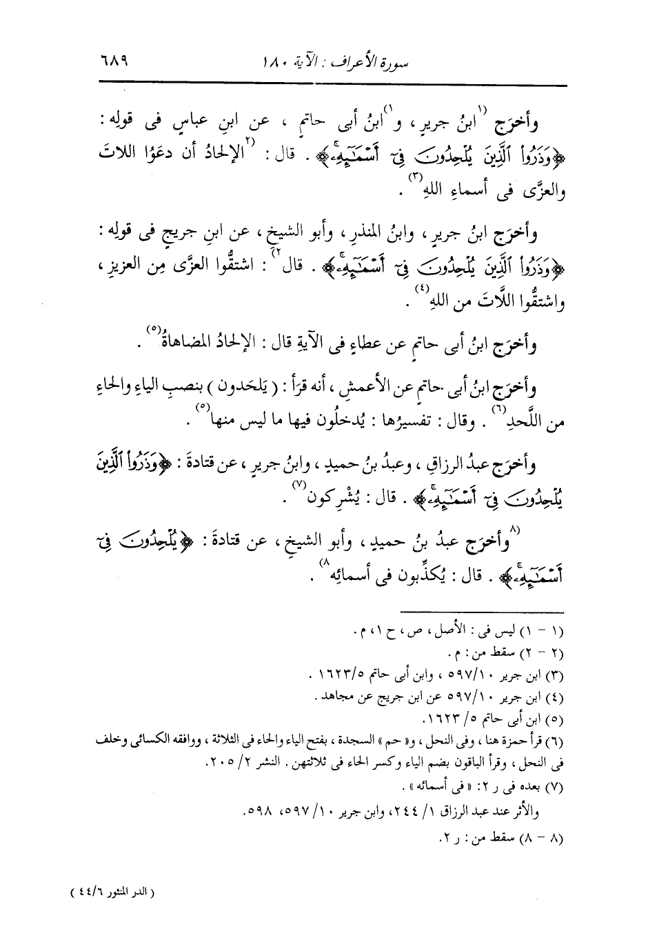وأخرج عبد الرزاق وعبد حميد ، وَابن جَرِير عن قتادة {وذروا الذين يلحدون في أسمائه} قال : يشركون ، واخرج عَبد بن حُمَيد وأبو الشيخ عن قتادة {يلحدون في أسمائه} قال : يكذبون في أسمائه