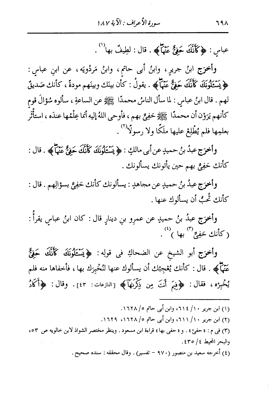 وأخرج ابن جرير ، وَابن أبي حاتم ، وَابن مردويه عن ابن عباس {يسألونك كأنك حفي عنها} يقول : كان بينك وبينهم مودة كأنك صديق لهم قال ابن عباس : لما سأل الناس محمد صلى الله عليه وسلم عن الساعة سألوه سؤال قوم كأنهم يرون أن محمدا حفي بهم فأوحى الله إليه : إنما علمها عنده استأثر بعلمها فلم يطلع عليها ملكا ولا رسولا.