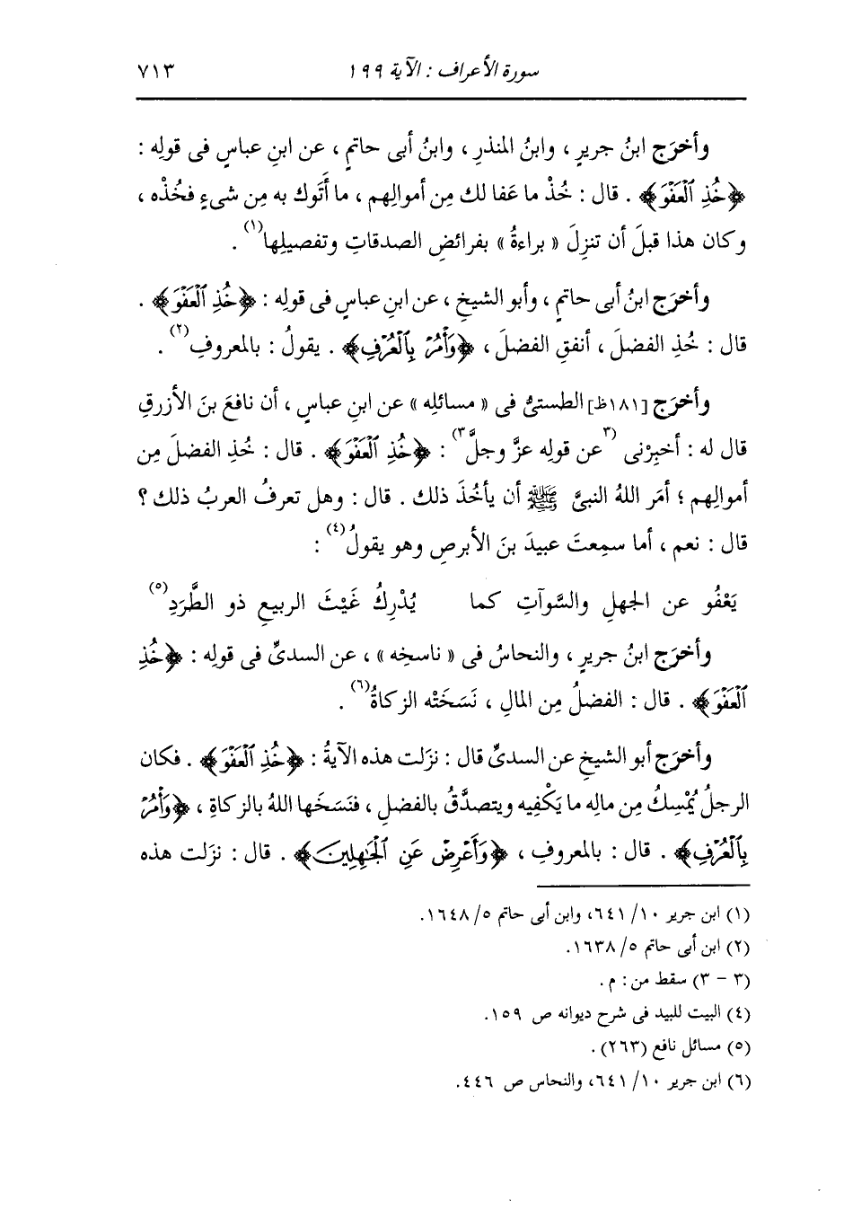 وأخرج الطستي في مسائله عن ابن عباس أن نافع بن الأرزق قال له : أخبرني {خذ العفو} قال : خذ الفضل من أموالهم أمر الله النَّبِيّ صلى الله عليه وسلم أن يأخذ لك ، قال : وهل تعرف العرب ذلك قال : نعم أما سمعت عبيد بن الأبرص وهو يقول : يعفو عن الجهل والسوآت كما * يدرك غيث الربيع ذو الطرد.