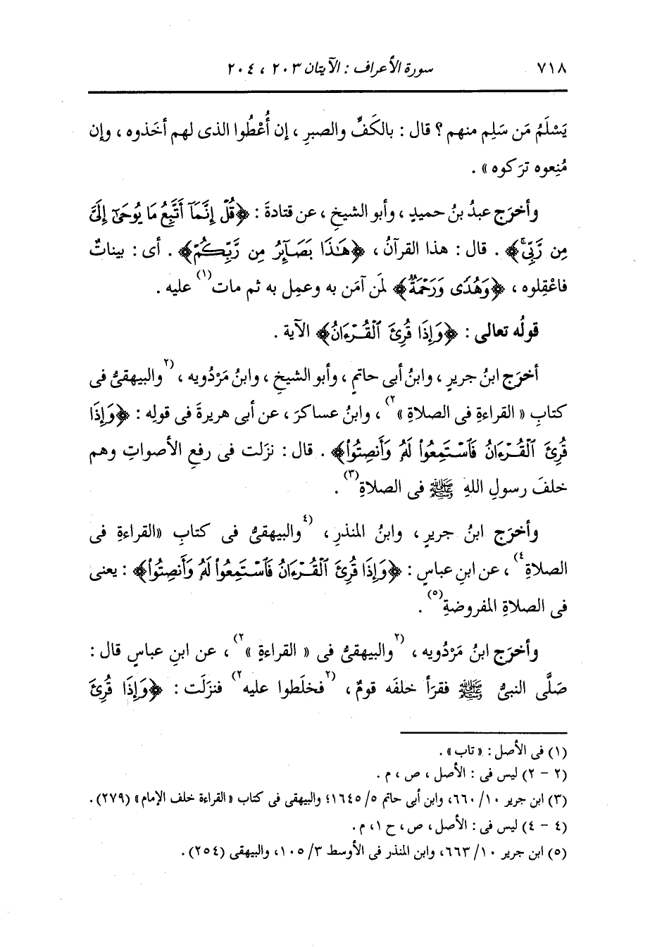 أَخْرَج ابن جرير ، وَابن أبي حاتم وأبو الشيخ ، وَابن مردويه ، وَابن عساكر عن أبي هريرة في قوله {وإذا قرئ القرآن فاستمعوا له وأنصتوا} قال : نزلت في رفع الأصوات وهم خلف رسول الله صلى الله عليه وسلم في الصلاة.