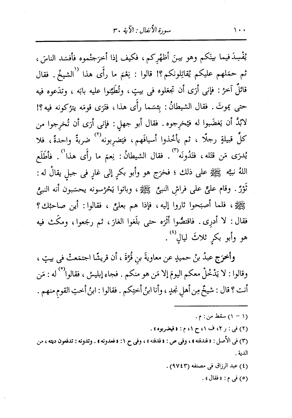 وأخرج عبد الرزاق ، وعَبد بن حُمَيد عن قتادة رضي الله عنه قال : دخلوا دار الندوة يأتمرون بالنبي صلى الله عليه وسلم فقالوا : لا يدخل عليكم أحد ليس منكم فدخل معهم الشيطان في صورة شيخ من أهل نجد فتشاوروا فقال أحدهم : نخرجه : فقال الشيطان : بئسما رأى هذا هو قد كاد أن