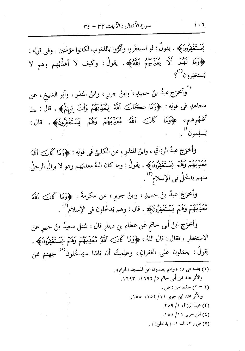 وأخرج عَبد بن حُمَيد ، وَابن جَرِير ، وَابن المنذر ، وَابن أبي حاتم وأبو الشيخ عن عطية رضي الله عنه في قوله {وما كان الله ليعذبهم وأنت فيهم} يعني المشركين حتى يخرجك منهم {وما كان الله معذبهم وهم يستغفرون} قال : يعني المؤمنين ثم أعاد المشركين فقال {وما لهم ألا يعذبهم الله وهم يصدون عن المسجد الحرام}.