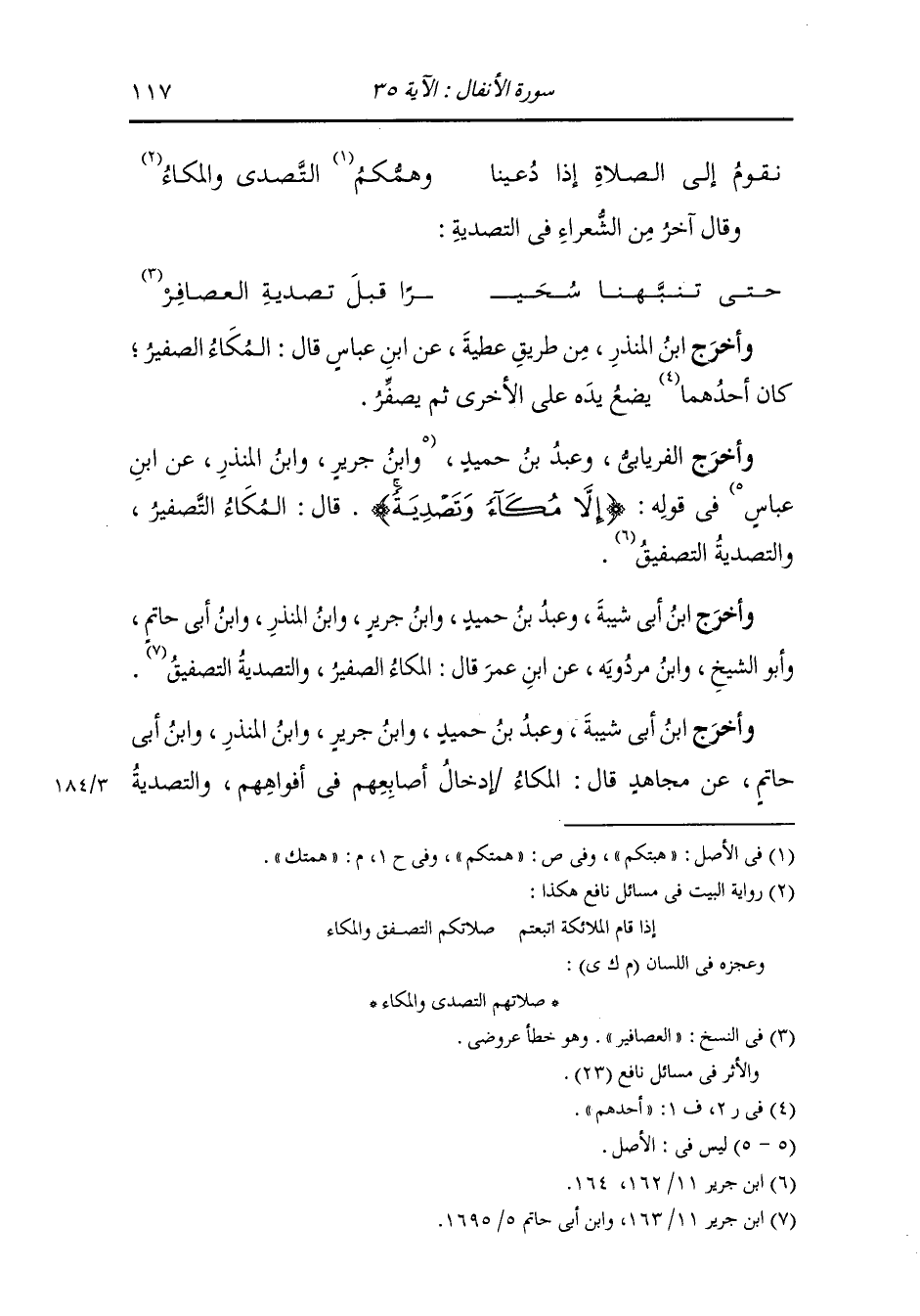وأخرج الطستي عن ابن عباس رضي الله عنهما ، أن نافع بن الأزرق قال له : أخبرني عن قوله عز وجل {إلا مكاء وتصدية} قال : المكاء صوت القنبرة ، والتصدية صوت العصافير وهو التصفيق ، وذلك أن رسول الله صلى الله عليه وسلم كان إذا قام إلى الصلاة وهو بمكة كان يصلي قائما بين الحجر والركن اليماني فيجيء رجلان من بني سهم يقوم أحدهما عن يمينه والآخر عن شماله ويصيح أحدهما كما يصيح المكاء والآخر يصفق بيديه تصدية العصافير ليفسد عليه صلاته ، قال : وهل تعرف العرب ذلك ققال : نعم أما سمعت حسان بن ثابت رضي الله تعالى عنه يقول :