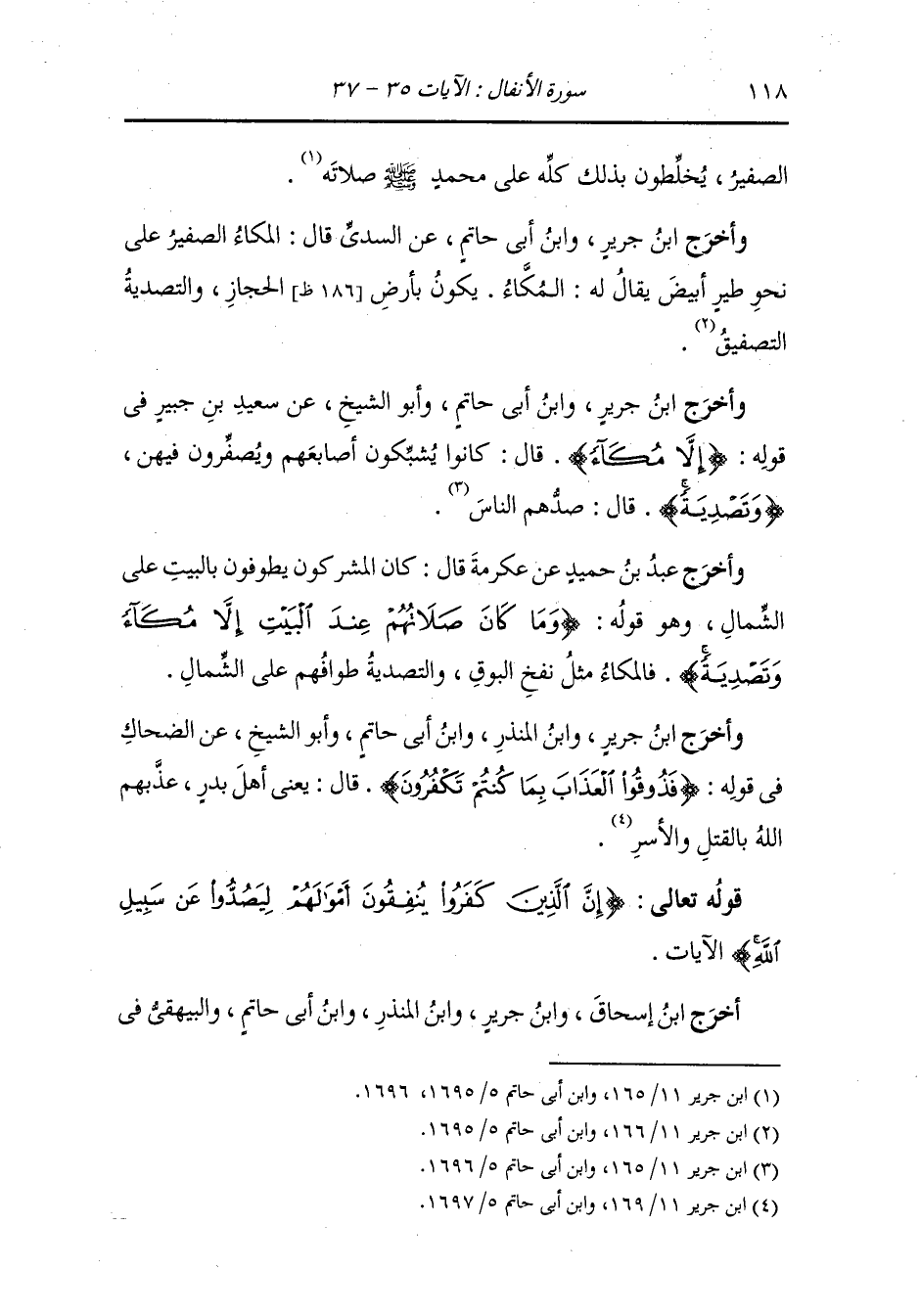وَأخرَج ابن المنذر من طريق عطية عن ابن عباس رضي الله عنه قال : المكاء الصفير ، كان أحدهما يضع يده على الأخرى ثم يصفر.
