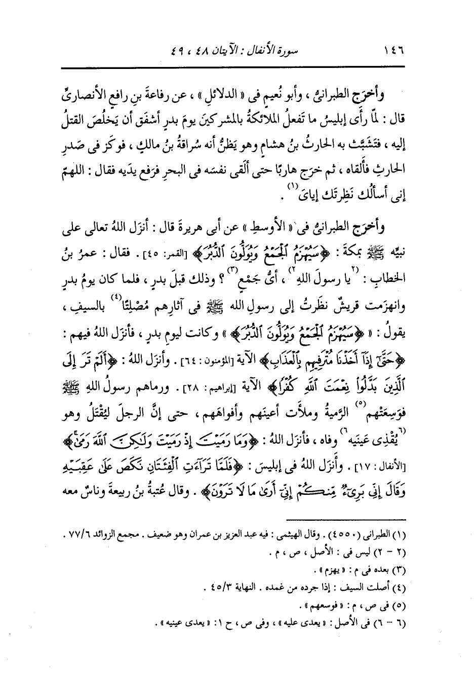 وأخرج الواقدي ، وَابن مردويه عن ابن عباس رضي الله عنهما قال : لما تواقف الناس أغمي على رسول الله صلى الله عليه وسلم ساعة ثم سري عنه فبشر الناس بجبريل عليه السلام في جند من الملائكة ميمنة الناس وميكائيل في جند آخر ميسرة وإسرافيل في جند آخر ألف وإبليس قد تصور في صورة سراقة بن جعشم المدلجي يجير المشركين ويخبرهم أنه لا غالب لهم اليوم من الناس فلما أبصر عدو الله الملائكة {نكص على عقبيه وقال إني بريء منكم إني أرى ما لا ترون} فتثبت به الحارث وانطلق إبليس لا يرى حتى سقط في البحر ورفع يديه وقال : يا رب موعدك الذي وعدتني