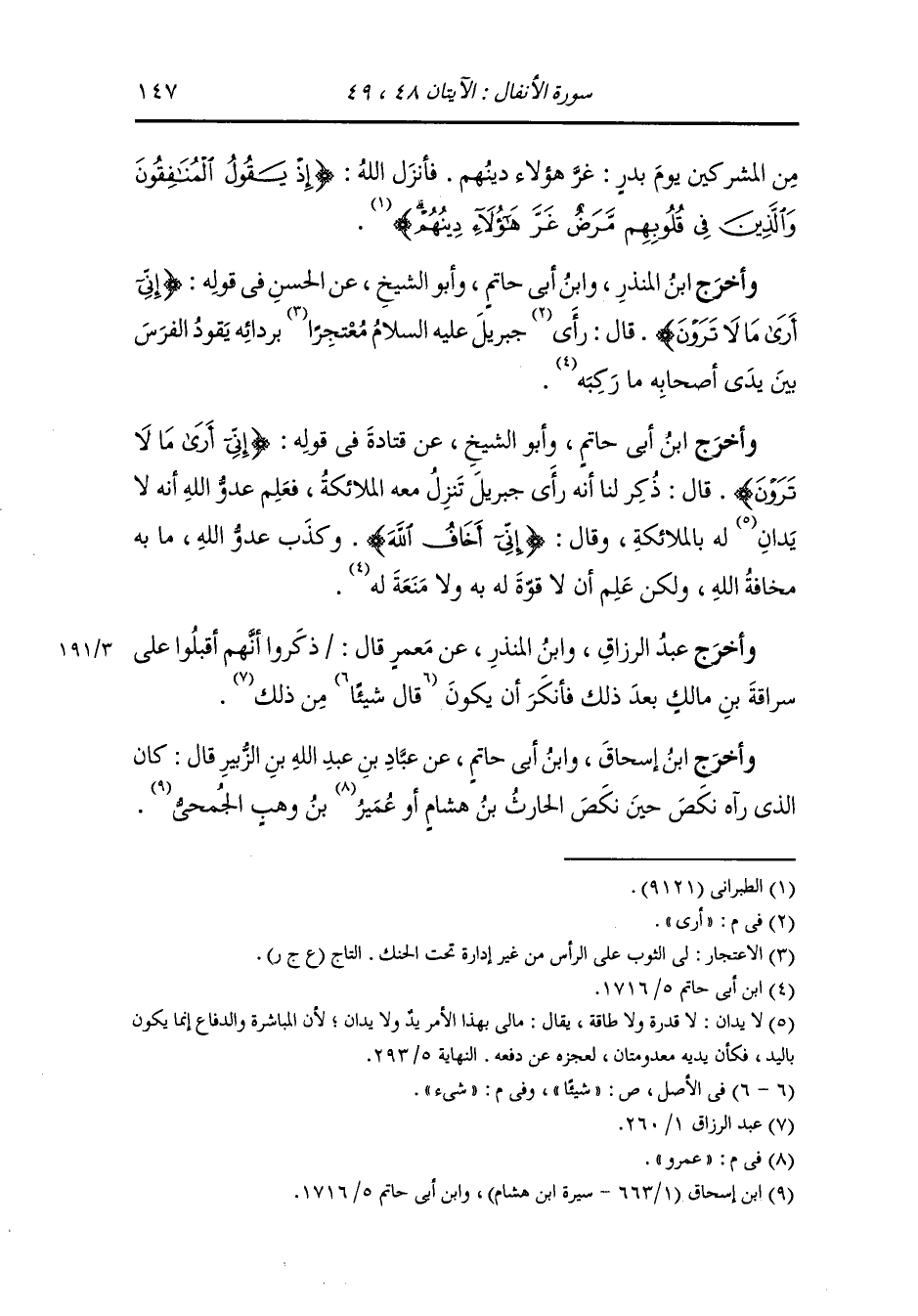 الآية ، وأنزل الله (ألم تر إلى الذين بدلوا نعمة الله كفرا) (إبراهيم الآية 28) الآية ، ورماهم رسول الله فوسعهم الرمية وملأت أعينهم وأفواههم حتى أن الرجل ليقتل وهو يقذي عينيه وفاه فأنزل الله (وما رميت إذ رميت ولكن الله رمى) (الأنفال الآية 17) وأنزل الله في إبليس {فلما تراءت الفئتان نكص على عقبيه وقال إني بريء منكم إني أرى ما لا ترون} وقال عتبة بن ربيعة وناس معه