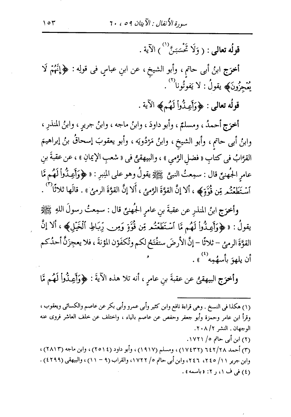 وأخرج ابن مردويه والبيهقي في شعب الإيمان عن سليم بن عامر رضي الله عنه قال : كان بين معاوية وبين الروم عهد وكان يسير حتى يكون قريبا من أرضهم فإذا انقضت المدة أغار عليهم فجاءه عمرو بن عبسة فقال : الله أكبر وفاء لا غدر سمعت رسول الله صلى الله عليه وسلم يقول من كان بينه وبين قوم عهد فلا يشد عقدة ولا يحلها حتى ينقضي أمرها أو ينبذ إليهم على سواء قال : فرجع معاوية بالجيوش.