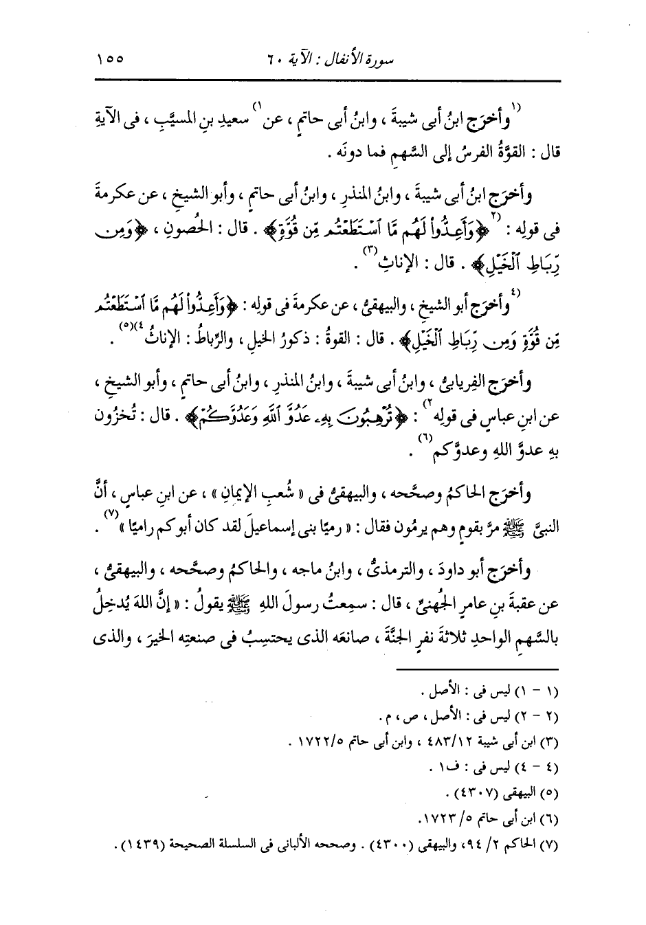 وأخرج ابن إسحاق ، وَابن أبي حاتم عن عباد بن عبد الله بن الزبير رضي الله عنه في قوله {وأعدوا لهم ما استطعتم من قوة} قال : أمرهم بإعداد الخيل.